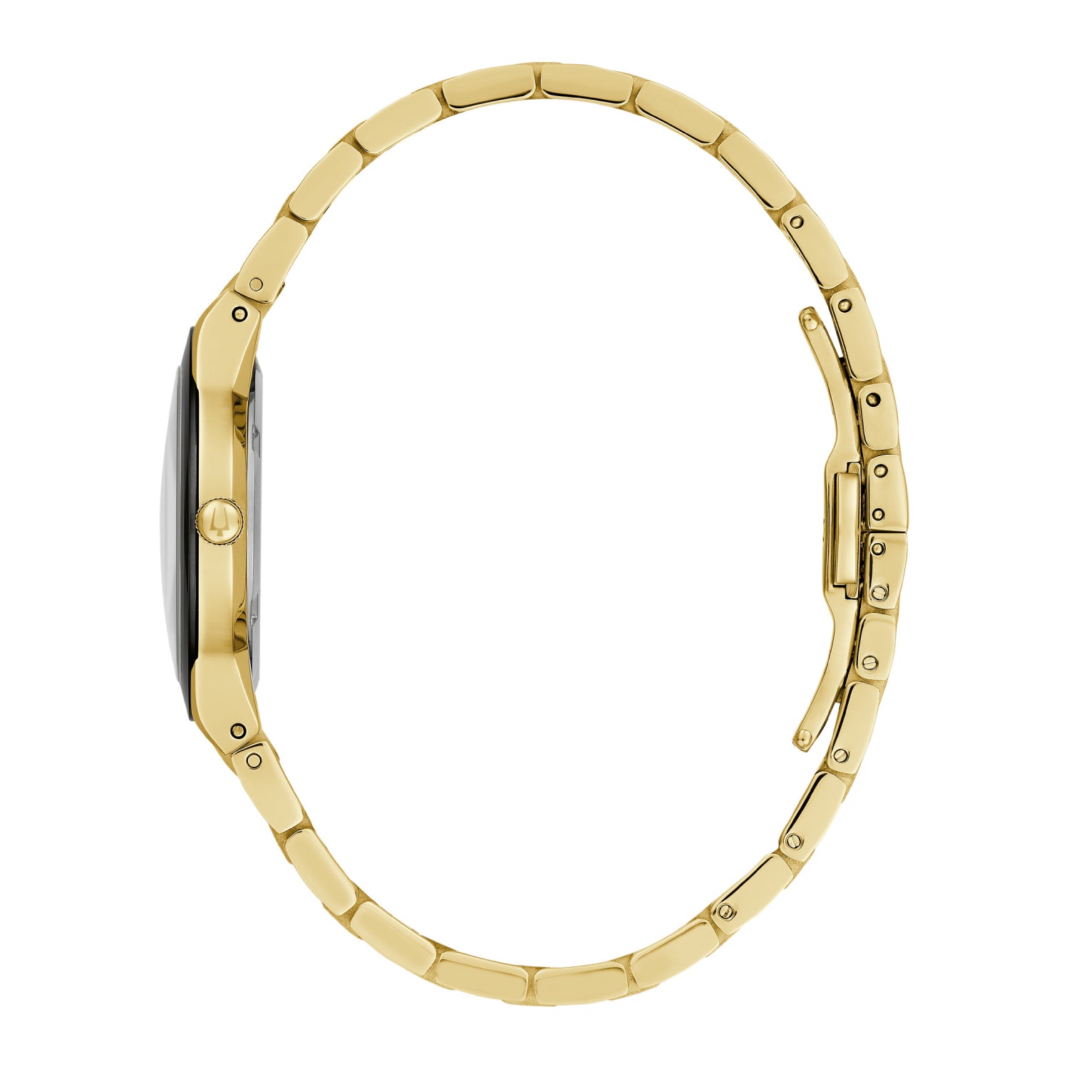 Una clase magistral de diseño moderno, este sofisticado reloj de la colección Bulova Ladies' Modern añadirá un toque contemporáneo a su estilo. El diseño de la caja de acero inoxidable en tono dorado presenta un cristal de zafiro abovedado metalizado de borde a borde que se extiende para formar el bisel negro del reloj, mientras que una silueta elegante fluye a la perfección en un brazalete de acero inoxidable en tono dorado a juego con eslabones centrales cepillados y un cierre desplegable con botón pulsador para un perfil elegante. Un anillo de caja en tono dorado rodea la espectacular esfera negra, que supera los límites del minimalismo sin marcadores y agujas angulares en tono dorado. Con un compromiso inquebrantable con el diseño moderno, este reloj de Bulova para mujer llevará cualquier guardarropa más allá de lo convencional.