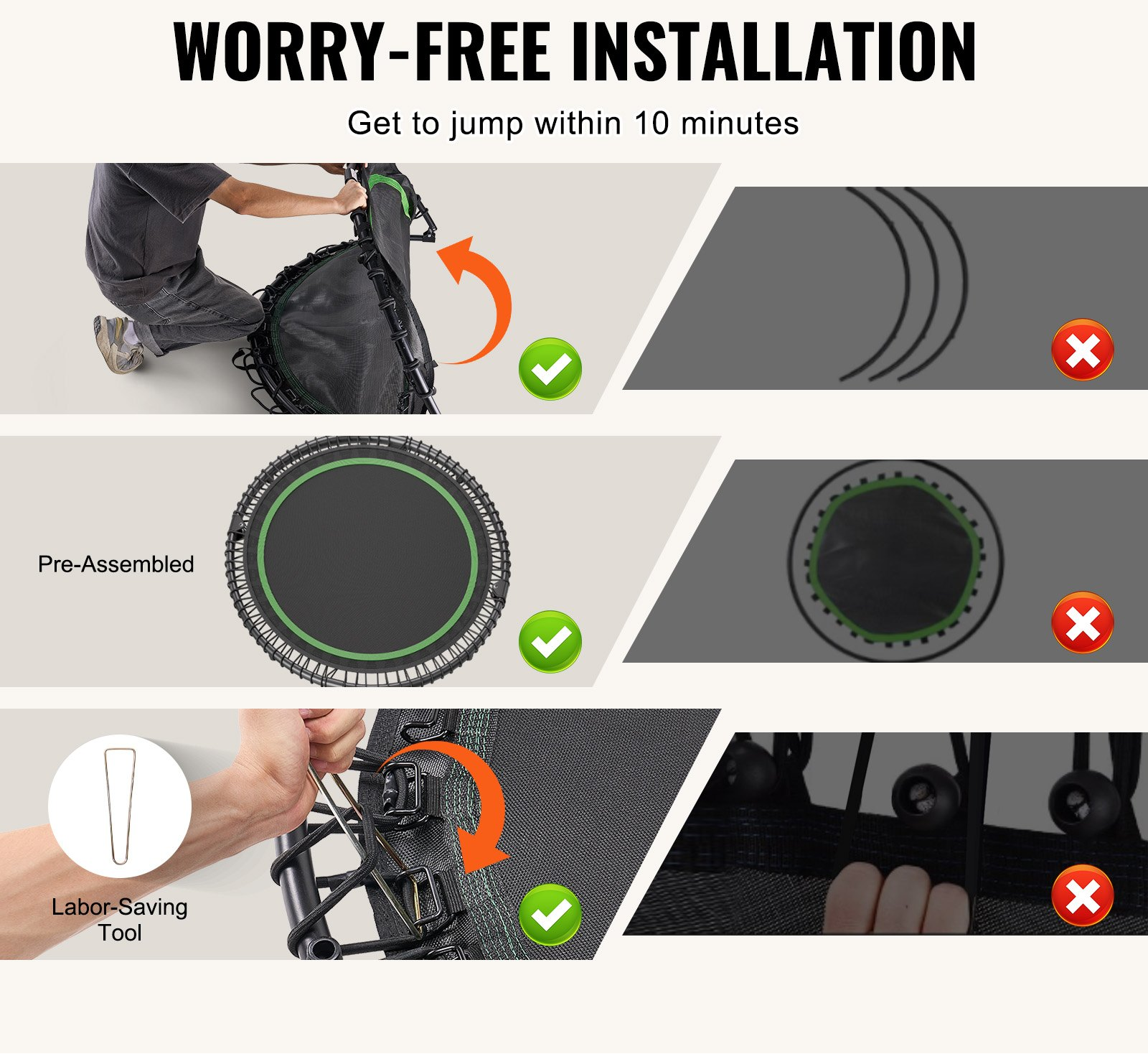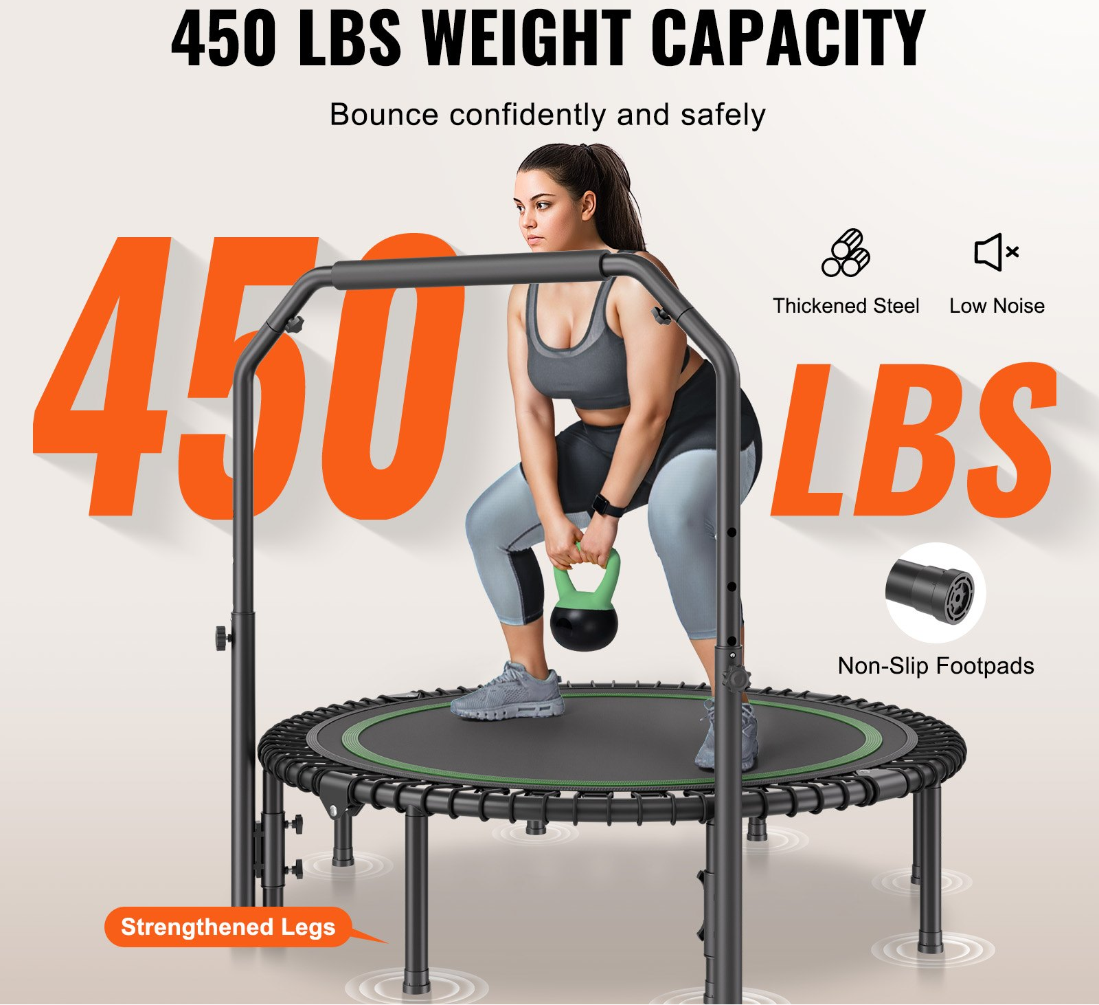 Foldable Mini Trampoline, 51 Inch Fitness Rebounder, Max Load 450lbs Exercise Trampoline, Stable & Quiet Trampoline with 4 Level Height Adjustable Foam Handle, for Adults Indoor/Garden Workout