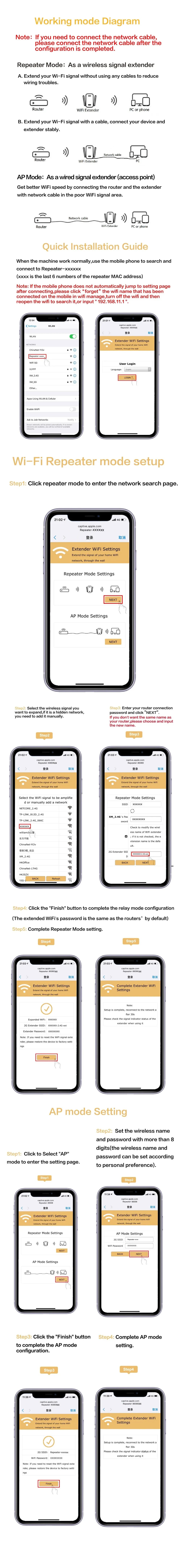 1. Cuando el transmisor esté enchufado y en uso, busque Repeater-XXXXXX en la red wifi del teléfono móvil o la computadora y, después de hacer clic en la conexión, saltará automáticamente a la página de configuración (Nota: si la interfaz de salto no aparece después de hacer clic en la conexión en el teléfono móvil, haga clic en "Ignorar esta red" y luego vuelva a encender la red wifi para volver a conectarse a la red wifi. Si esta operación aún no funciona, puede ingresar manualmente la URL "192.168.11.1" en el navegador).