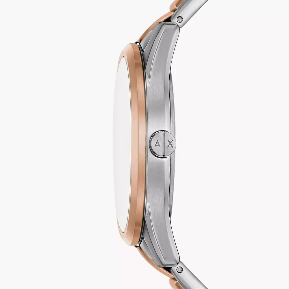 Presentamos el reloj Armani Exchange Dante de 38 mm con brazalete de oro rosa y plata en dos tonos y una cautivadora esfera azul. Adopte la sofisticación y el estilo con este exquisito reloj que complementa sin esfuerzo tanto la vestimenta informal como la formal. La llamativa esfera azul, elegantemente envuelta en un brazalete de oro rosa y plata en dos tonos, le da un toque de elegancia a cualquier muñeca. Con un preciso movimiento de cuarzo y un cristal mineral resistente a los arañazos, este reloj ofrece confiabilidad y durabilidad. Eleve su estilo con el reloj Armani Exchange Dante, un accesorio atemporal que encarna la combinación perfecta de funcionalidad y elegancia atemporal.
