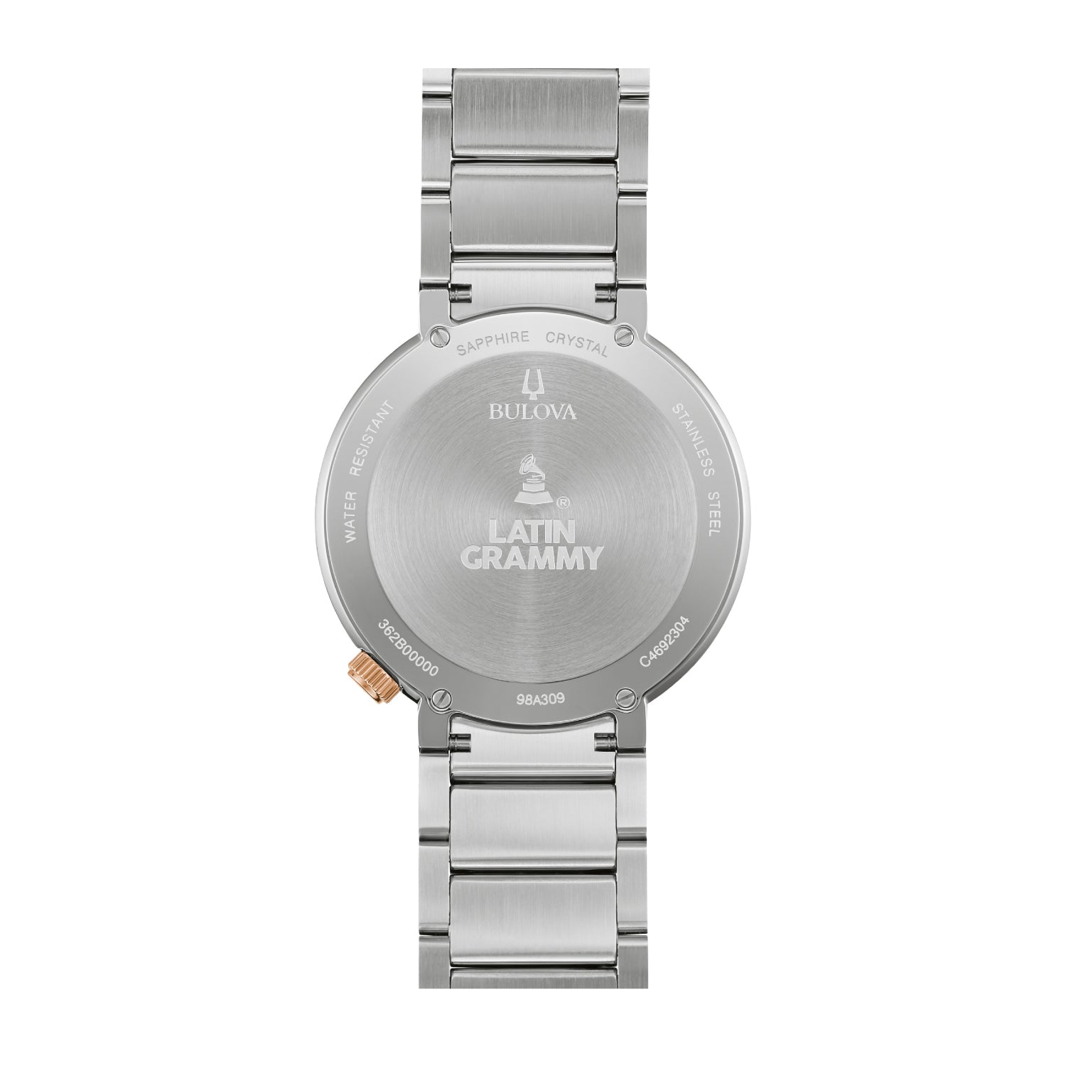 Este nuevo reloj para hombre de Bulova se suma a la Colección Latin Grammy y continúa la celebración de la marca de la entrega de premios y los artistas extraordinarios que la hacen posible. Un cristal de zafiro metalizado curvado de borde a borde crea una caja de 42 mm excepcionalmente moderna, que presenta acero inoxidable en tono plateado y una corona en tono oro rosa. La esfera texturizada está acentuada con manecillas y marcadores en tono oro rosa y una subesfera de 24 horas. En la parte posterior del reloj, la caja con tapa atornillada está estampada con el logotipo de Latin Grammy. El reloj se combina perfectamente con una pulsera de dos tonos a juego con cierre desplegable. Lleve el espíritu de los premios Latin Grammy y sus increíbles artistas con este nuevo reloj para hombre de Bulova.