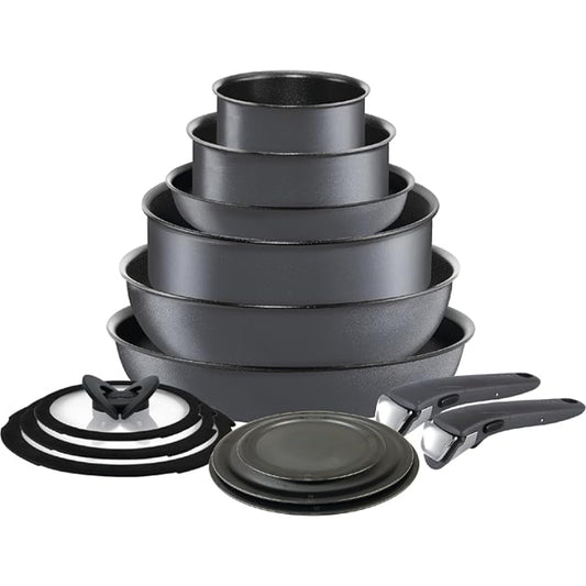 Haz clic, cocina y apila con T-fal Ingenio, el sistema de cocina Genius. Este utensilio de cocina de inducción antiadherente de PTFE está diseñado con un mango desmontable patentado y seguro que se puede quitar para apilar las ollas y sartenes y ahorrar hasta un 50 % de espacio en la alacena. Coloca el mango y Ingenio pasa de la cocina al horno, a la mesa y al frigorífico para ofrecer la máxima versatilidad. Este juego también cuenta con el revestimiento antiadherente Platinum de T-fal, que es 10 veces más resistente que el revestimiento básico de T-fal.
