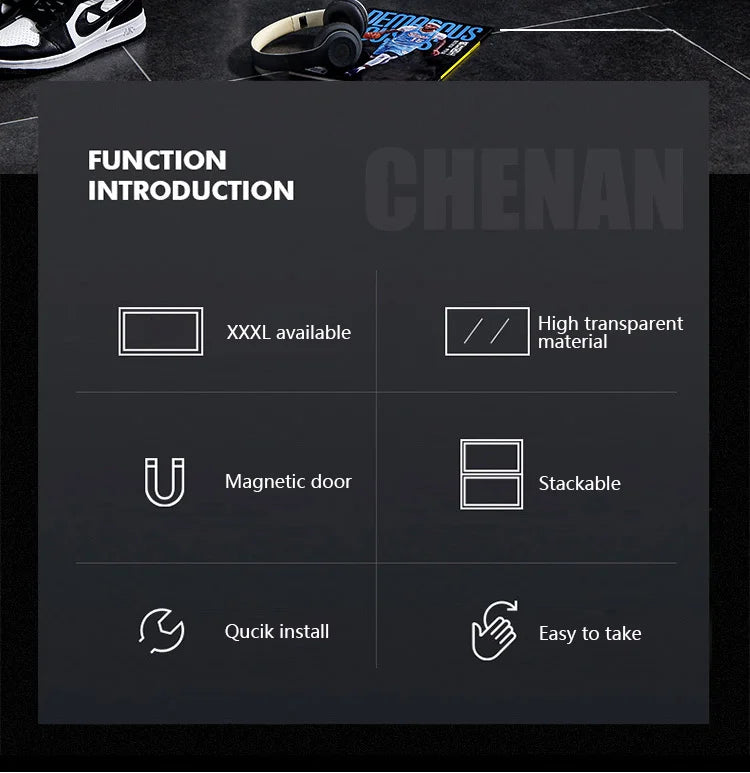 Organize your footwear collection with the AJ Sneaker Box Shoes Organizer. Designed to keep your high-tops and other shoes dust-free and visible, these transparent storage boxes are the ideal solution for anyone looking to declutter their space. Crafted from durable, eco-friendly plastic, each box offers a robust and stylish way to display your favorite kicks while providing easy access. With a stackable design, you can maximize vertical space in your closet or entryway, making it perfect for homes of all sizes. Whether you're a sneaker enthusiast or simply want to simplify your shoe storage, the AJ Sneaker Box is your answer. Say goodbye to mismatched shoes and frantically searching through cluttered closets. Now, your shoes can shine as they deserve, all while being well-protected.