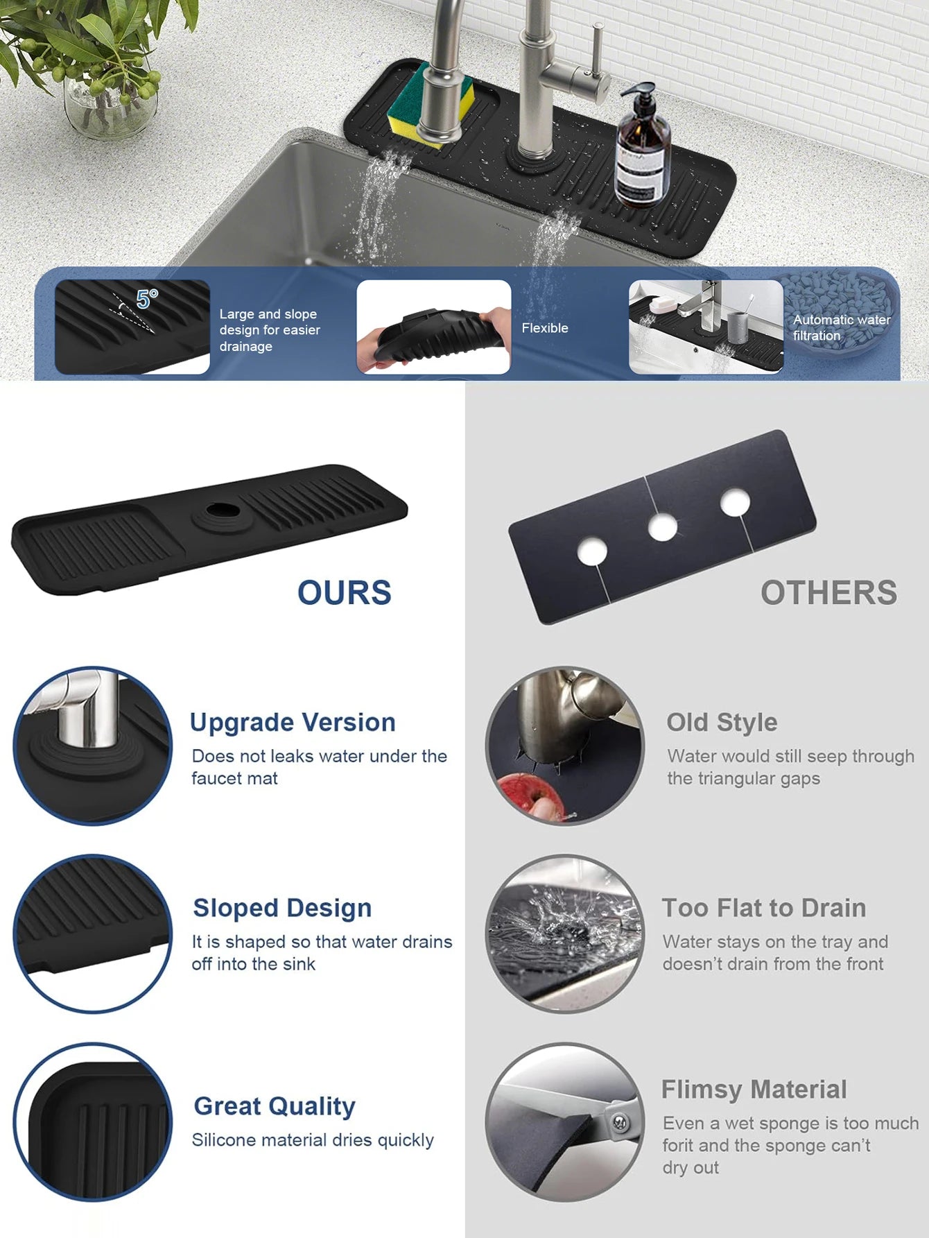 【APLICACIONES MULTIFUNCIONALES】 No es solo un protector contra salpicaduras de tapete de grifo, también es un colector de goteo lavable para grifo de fregadero, bandeja de jabón para platos, tapete para secar platos. Para la cocina: coloque esponja, jabón para platos, detergente, cepillo y botella sobre él. Para el baño: coloque limpiador facial, maquinilla de afeitar, taza de cepillo de dientes sobre él. Se usa como un pequeño tapete organizador, almohadilla de drenaje. Es un dispositivo de cocina y baño súper práctico