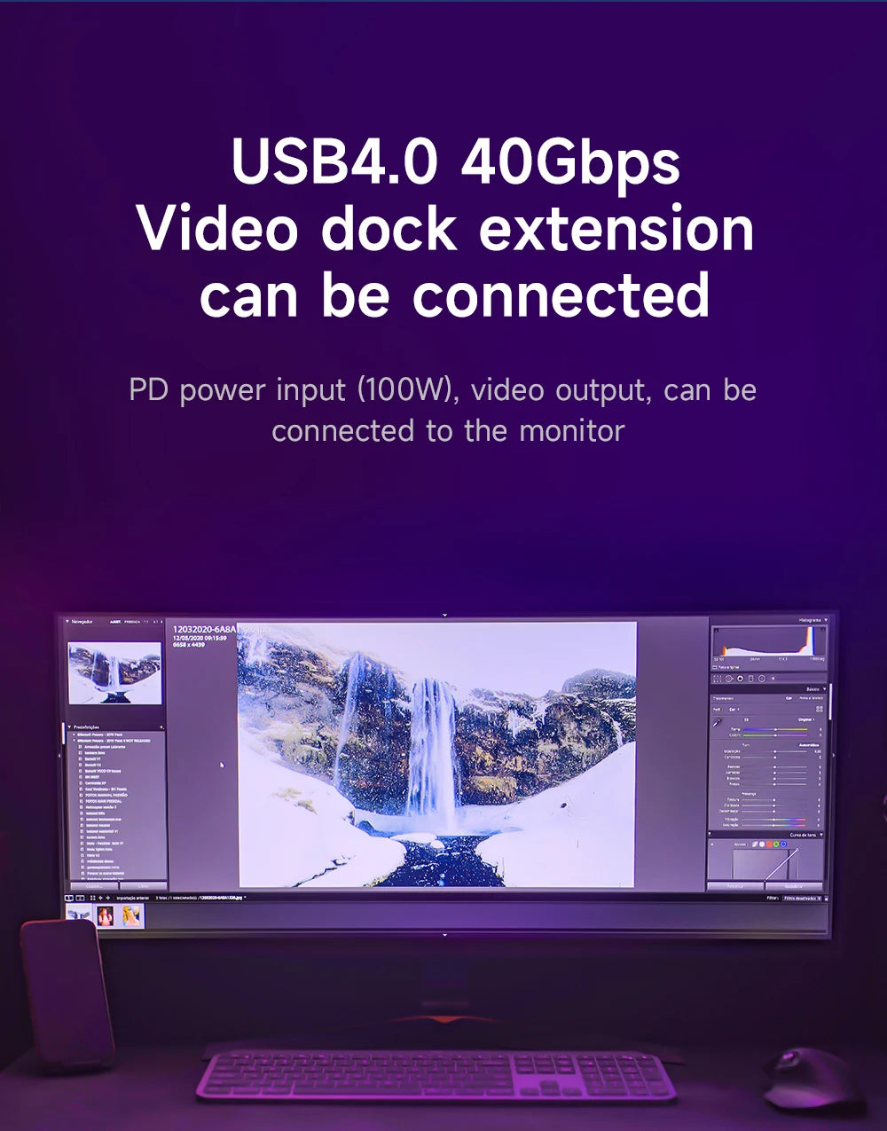 USB tipo C totalmente funcional y potente; admite transmisión de datos de 40 Gbps/entrada de alimentación PD (requiere 100 W)/salida DP1.4; interfaz de audio 4 USB3.0 + 2 USB2.0 de 3,5 mm y ranura de bloqueo de seguridad, lo que lo hace más conveniente y seguro.