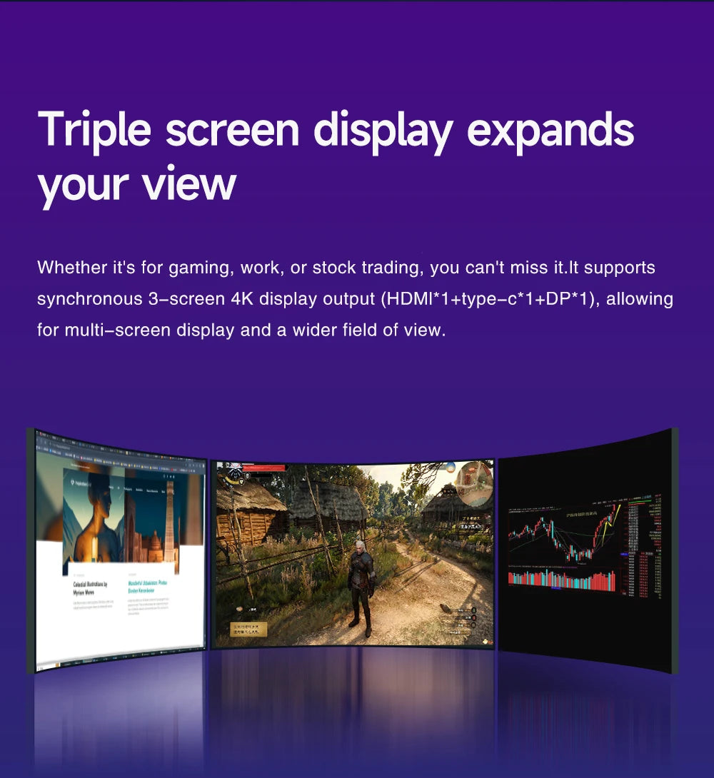 Ya sea para jugar, trabajar o comprar acciones, no te lo puedes perder. Admite salida de pantalla 4K de 3 pantallas sincrónicas (HDMI*1+DP*1+tipo-c1), lo que permite una visualización en múltiples pantallas y un campo de visión más amplio.