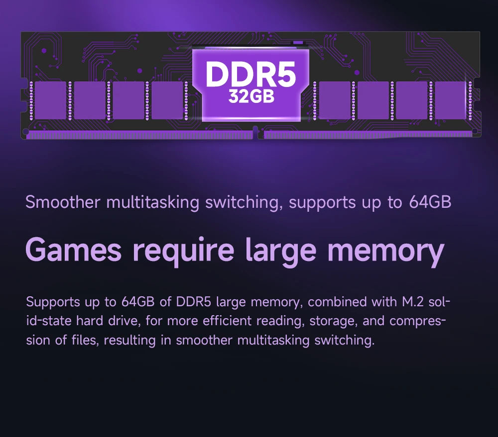 Admite hasta 64 GB de memoria grande DDR5, combinada con un disco duro de estado sólido M.2, para una lectura, almacenamiento y compresión de archivos más eficientes, lo que da como resultado una conmutación multitarea más fluida.