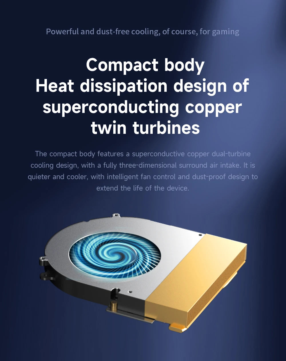 El cuerpo compacto cuenta con un diseño de refrigeración de doble turbina de cobre superconductor, con una entrada de aire envolvente completamente tridimensional. Es más silencioso y fresco, con control de ventilador inteligente y diseño a prueba de polvo para extender la vida útil del dispositivo.