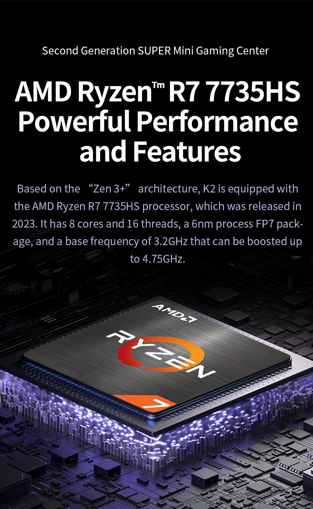 Basado en la arquitectura “Zen 3+”, el K2 está equipado con el procesador AMD Ryzen R7 7735HS, que fue lanzado en 2023. Tiene 8 núcleos y 16 subprocesos, un paquete FP7 de proceso de 6 nm y una frecuencia base de 3,2 GHz que se puede aumentar hasta 4,75 GHz.