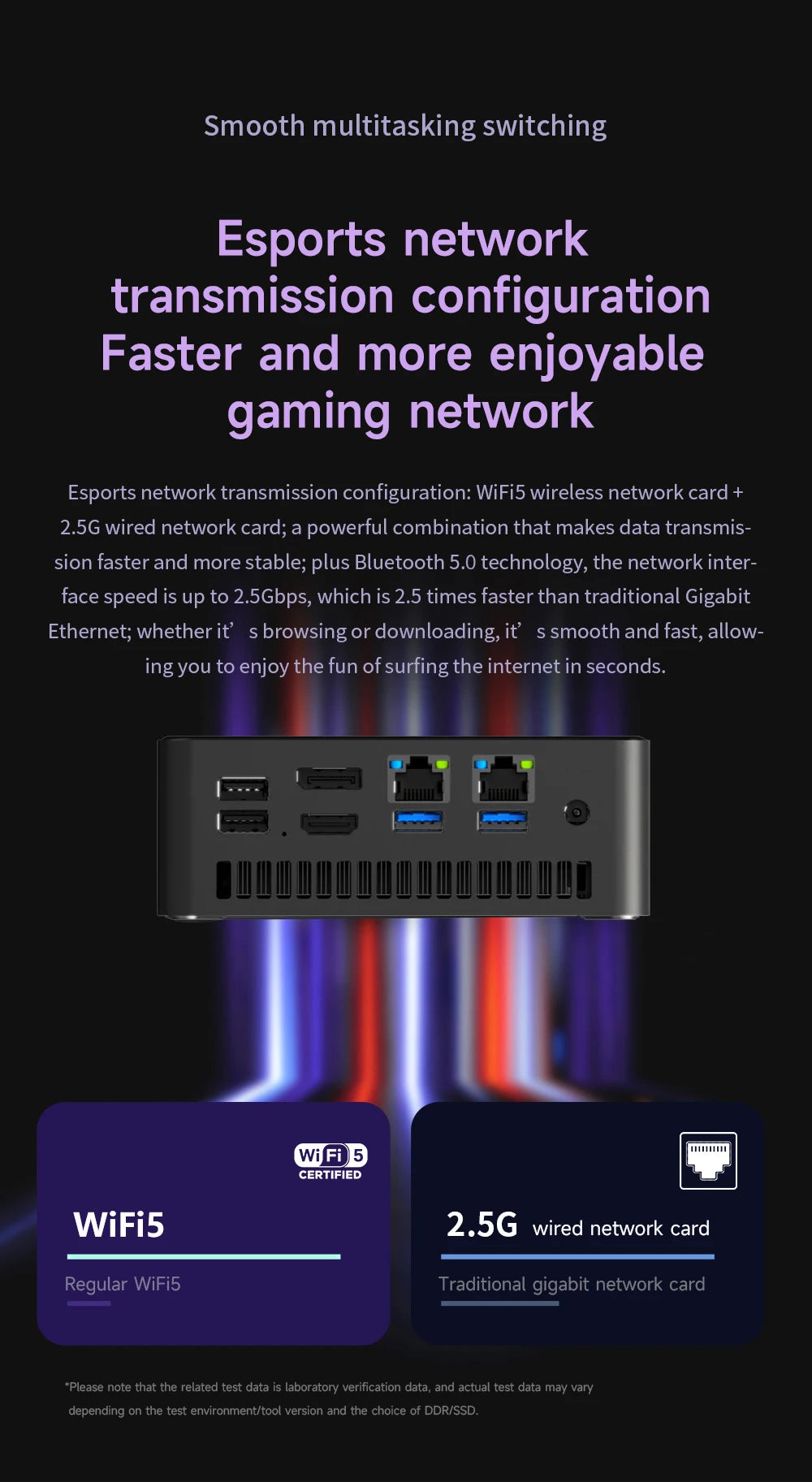 Configuración de transmisión de red de deportes electrónicos: tarjeta de red inalámbrica WiFi5 + tarjeta de red cableada 2.5G; una combinación poderosa que hace que la transmisión de datos sea más rápida y estable; además de la tecnología Bluetooth 5.0, la velocidad de la interfaz de red es de hasta 2.5 Gbps, que es 2.5 veces más rápido que el Gigabit Ethernet tradicional; ya sea navegando o descargando, es fluido y rápido, lo que le permite disfrutar de la diversión de navegar por Internet en segundos.