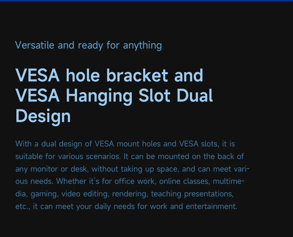 Con un diseño dual de orificios de montaje VESA y ranuras VESA, es adecuado para varios escenarios. Se puede montar en la parte posterior de cualquier monitor o escritorio, sin ocupar espacio, y puede satisfacer diversas necesidades. Ya sea para trabajo de oficina, clases en línea, multimedia, juegos, edición de video, renderizado, presentaciones de enseñanza, etc., puede satisfacer sus necesidades diarias de trabajo y entretenimiento.