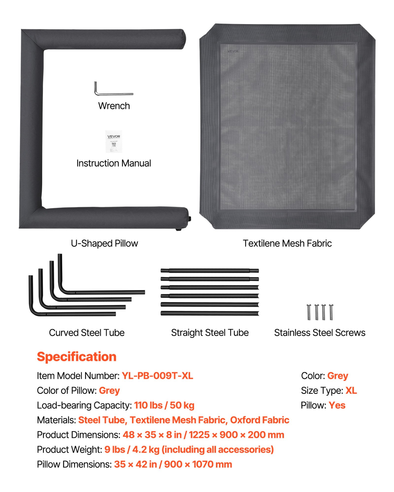 Size Type: XL,Load-bearing Capacity: 110 lbs / 50 kg,Pillow Dimensions: 35 x 42 in / 900 x 1070 mm,Color: Grey,Materials: Steel Tube, Textilene Mesh Fabric, Oxford Fabric,Item Model Number: YL-PB-009T-XL,Product Weight: 9 lbs / 4.2 kg (including all accessories),Product Dimensions: 48 x 35 x 8 in / 1225 x 900 x 200 mm,Color of Pillow: Grey,Pillow: Yes