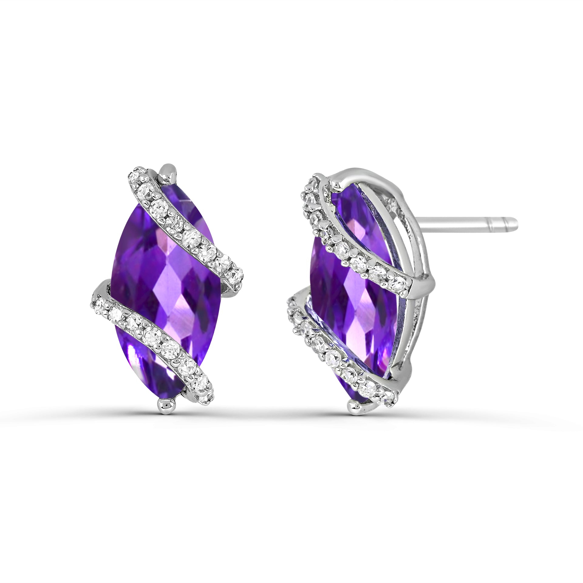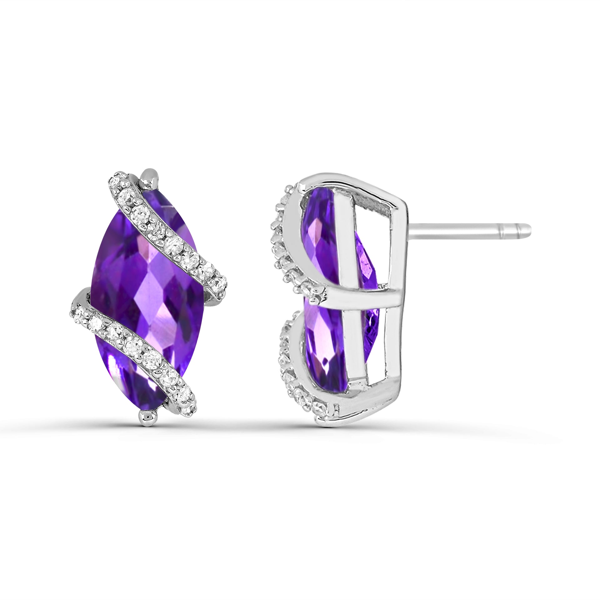 Disfrute de la elegancia con estos aretes tipo botón de plata esterlina de Affinity Designs, que cuentan con encantadoras piedras preciosas de amatista y topacio blanco brillante. La elegante fusión del cautivador tono púrpura de la amatista y el brillo radiante del topacio blanco crea un adorno atemporal y sofisticado, perfecto para agregar un toque de encanto refinado a cualquier look.