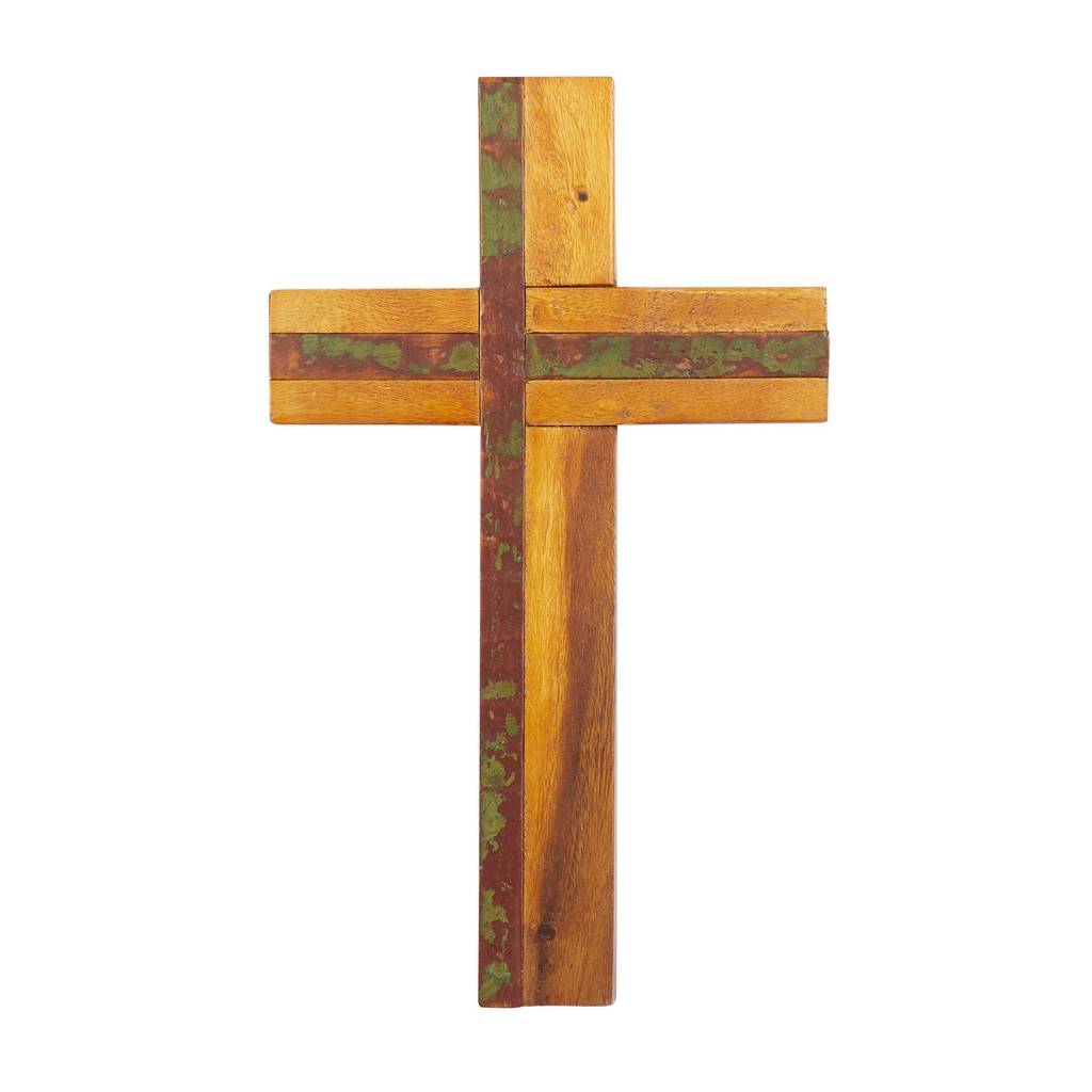 Celebrate spirituality in your space with the UMA Enterprises Rustic 20" x 12" Wood Cross Wall Decor - Brown. This beautifully crafted wall decor captures the essence of rustic charm with its natural golden brown hues and unique wood grain patterns. Its design features a harmonious blend of distressed sienna brown and green tones, creating a stunning textural patina look that adds warmth and depth to any room. Ideal for homes, offices, or places of worship, this wooden cross not only serves as decor but also as a meaningful symbol of faith. The included D-ring metal hardware ensures that it's easy and ready to hang, making it a hassle-free addition to your decor collection.