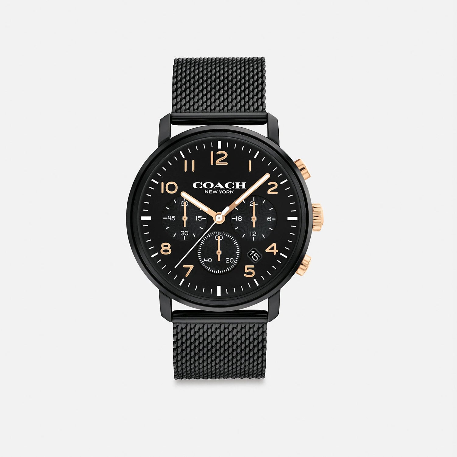 Un estilo atemporal con un diseño moderno, el Harrison es un reloj informal que se puede llevar en cualquier lugar. Este elegante reloj con pulsera de malla bañada en iones presenta una esfera lacada con tres subesferas que marcan los segundos, los minutos y las horas. El cronógrafo está detallado con una ventana de fecha y una combinación de marcadores numéricos y de barra. Reloj Coach Harrison, 42 mm - Negro. Color: negro