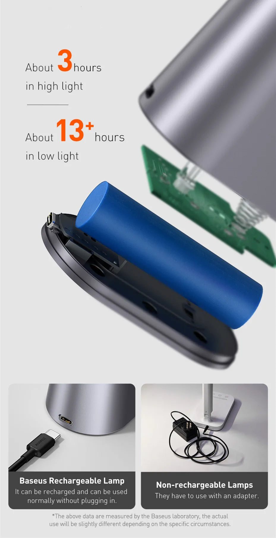 The sleek, modern design ensures it fits perfectly in any environment, making it an ideal companion for reading, studying, or working efficiently. With its robust 2200mAh battery, you can enjoy over 13 hours of cordless use, making it perfect for any location. The lamp's adjustable brightness and three color temperature modes allow you to customize your lighting for any occasion, ensuring you always have the perfect light at your fingertips. Transform your lighting experience today with the Baseus LED Desk Lamp and discover the difference it makes in your daily activities!