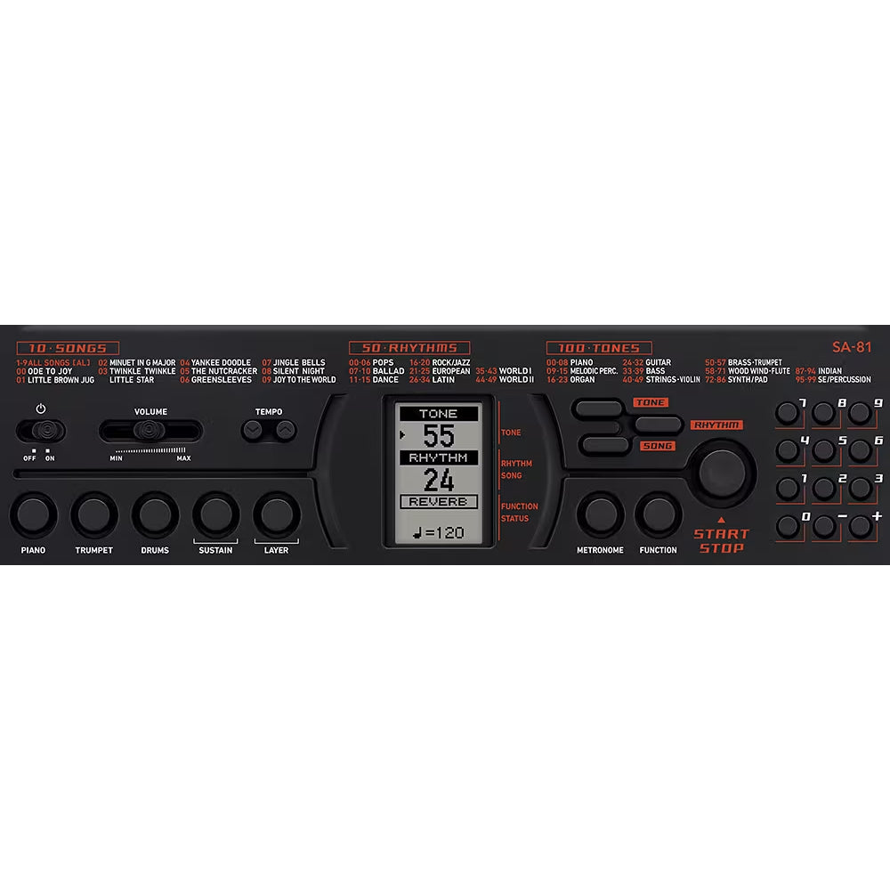 El Casio SA-81 es el comienzo perfecto para un viaje musical a cualquier edad. Cuenta con 44 teclas pequeñas que son perfectas para manos pequeñas y una pantalla LCD de fácil lectura para que la exploración sea muy sencilla. Mediante el uso de los altavoces estéreo integrados o auriculares, los músicos pueden descubrir su talento con una gran variedad de tonos y ritmos de alta calidad diseñados para estimular la creatividad. Las funciones de aprendizaje, como un metrónomo y una biblioteca de canciones, también están integradas, lo que convierte al SA-81 en una introducción ideal al aprendizaje de la música. El SA-81 puede funcionar durante horas utilizando 6 pilas AA o un adaptador de CA, y su diseño resistente y portátil es perfecto para crear música en cualquier momento y en cualquier lugar.