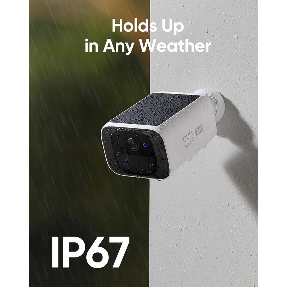Cámara solar con batería SoloCam S220 2K de eufy Security. Esta cámara captura videos con una resolución de 2560 x 1440 desde un campo de visión de 135°. Cuenta con un panel solar integrado y una batería recargable para obtener energía, funcionalidad de visión nocturna y 8 GB de almacenamiento interno. El audio bidireccional es posible gracias a un micrófono y un altavoz integrados. Una sirena de 75 dB mantiene a raya a los intrusos y a los invitados no deseados.