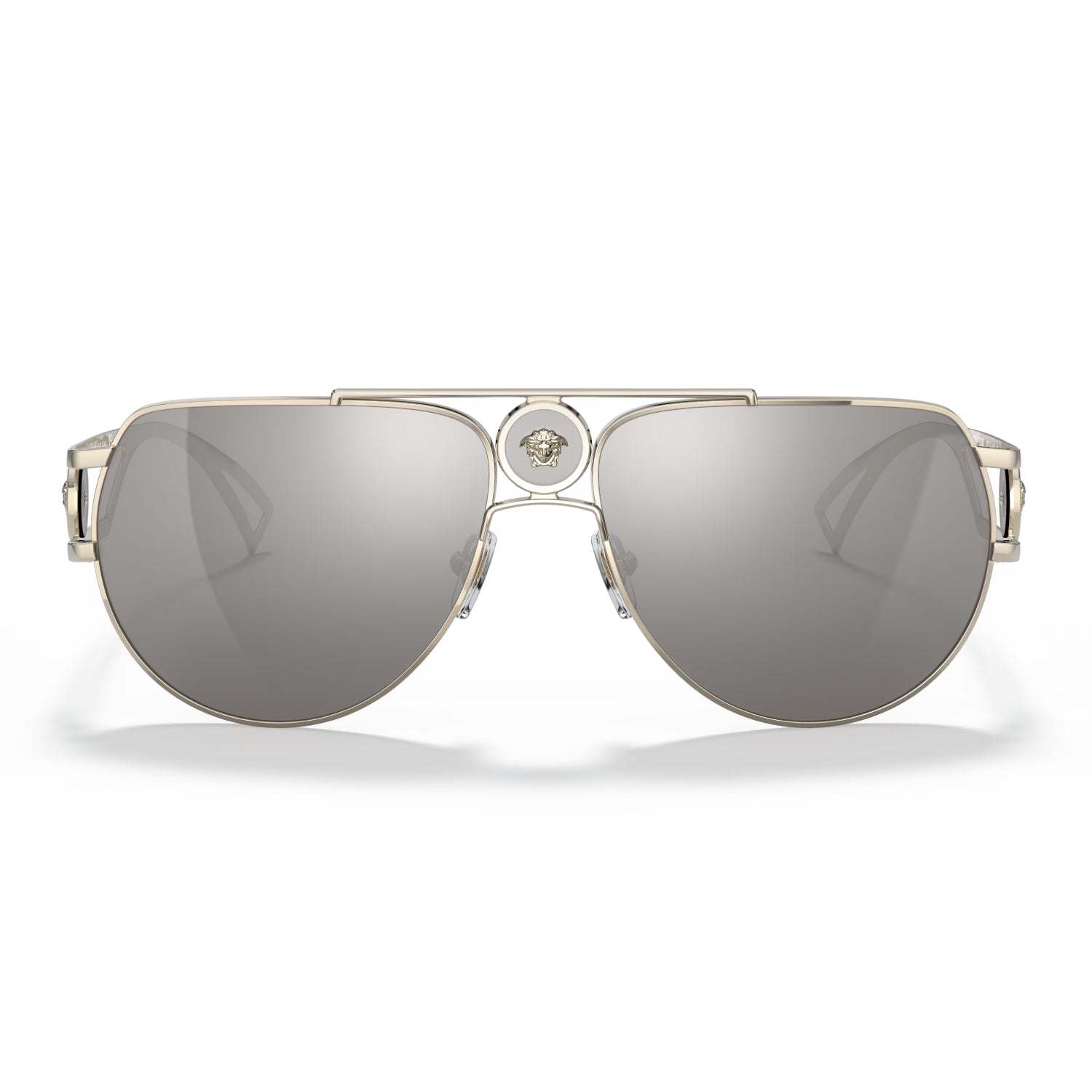 Disfrute del lujo con las gafas de sol con espejo estilo aviador VE2225 de Versace para hombre. Los marcos dorados pálidos exudan opulencia, mientras que las lentes plateadas con efecto espejo gris claro añaden un toque de misterio. Realce su estilo y adopte la combinación perfecta de moda y funcionalidad con estas icónicas gafas de sol estilo aviador de Versace.