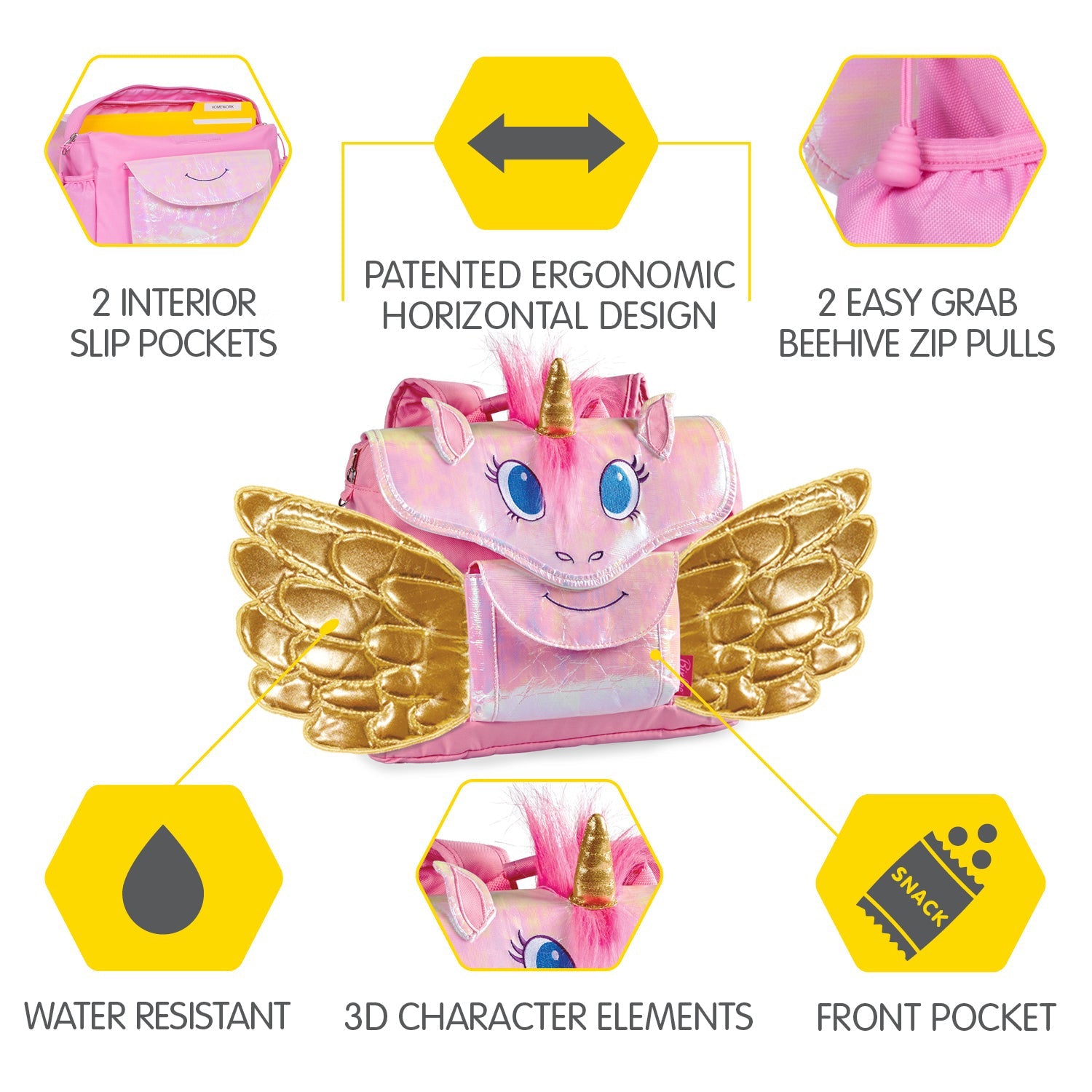 Mochila pequeña Bixbee de 12" con diseño de unicornio y alas doradas en poliéster, color rosa