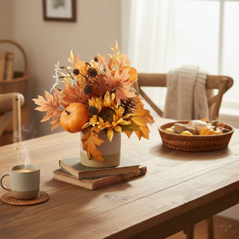 - Bright sunflowers, pumpkins & pinecones create a warm, festive autumn centerpiece.