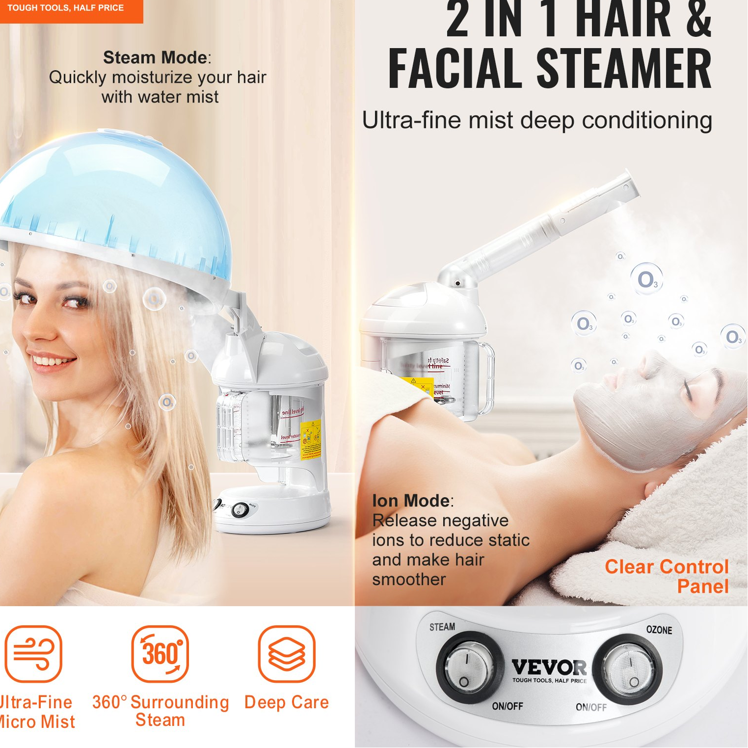 Hair Steamer, 2-in-1 Professional Hair & Facial Steamer with Detachable Bonnet Hood, Nano Ionic & UV Ozone Face Steamer with 360° Rotatable Sprayer for Salon Spa Home Beauty