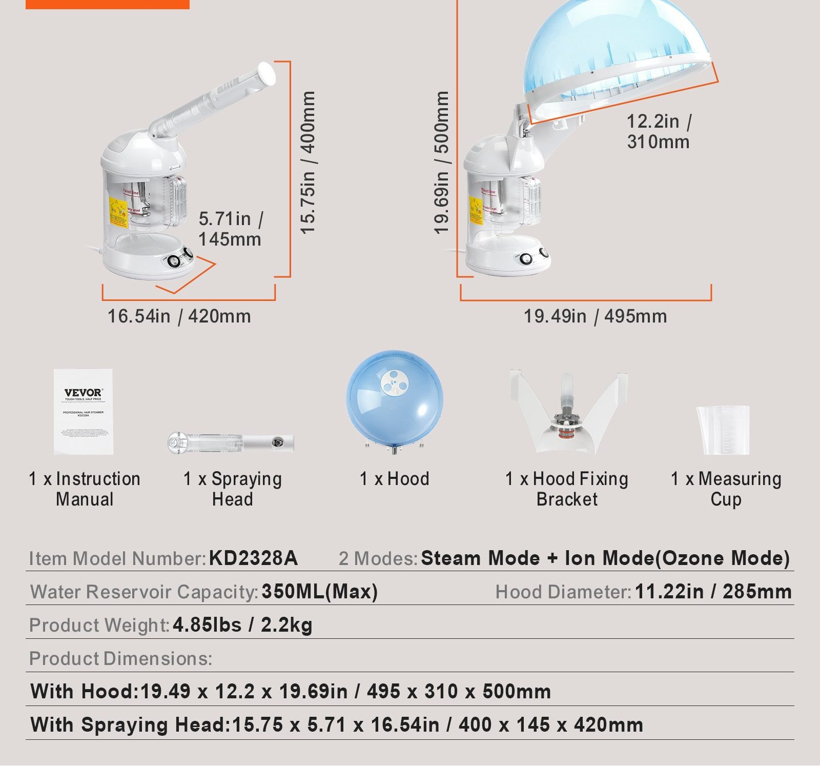 2 Modes: Steam Mode + Ion Mode,Water Reservoir Capacity: 350ML (Max),Item Model Number: KD2328A,Product Weight: 4.85 lbs / 2.2 kg,With Hood: 19.49 x 12.2 x 19.69 in / 495 x 310 x 500 mm,Product Dimensions:,With Spraying Head: 15.75 x 5.71 x 16.54 in / 400 x 145 x 420 mm,Hood Diameter: 11.22 in / 285 mm