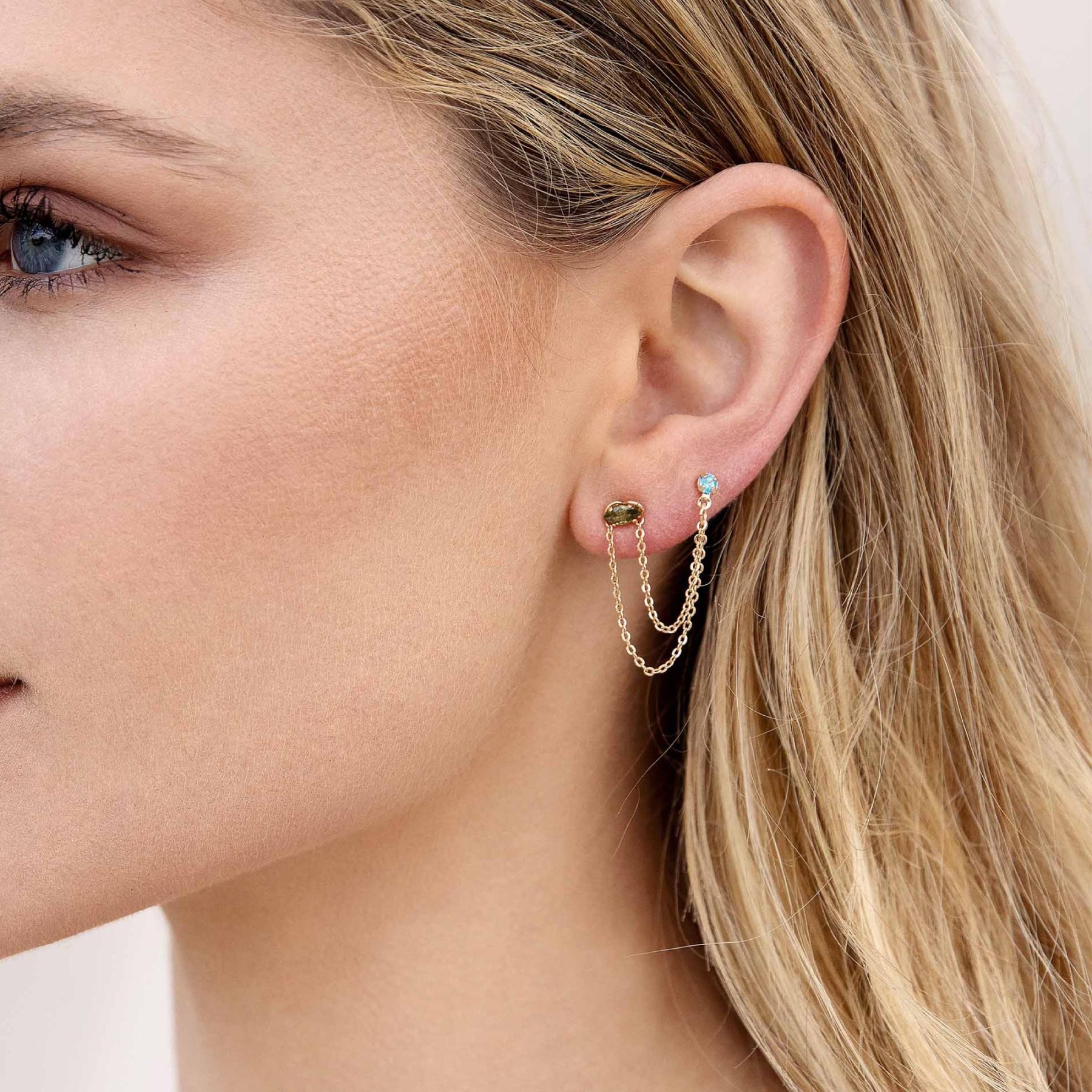 Dale un toque de glamour a tu look con estos impresionantes aretes colgantes de cristal azul bañados en oro de 18 k para mujer de Ettika. Estos aretes, que cuentan con una cadena perforada de dos orificios, son ideales para agregar un toque de brillo a cualquier atuendo.