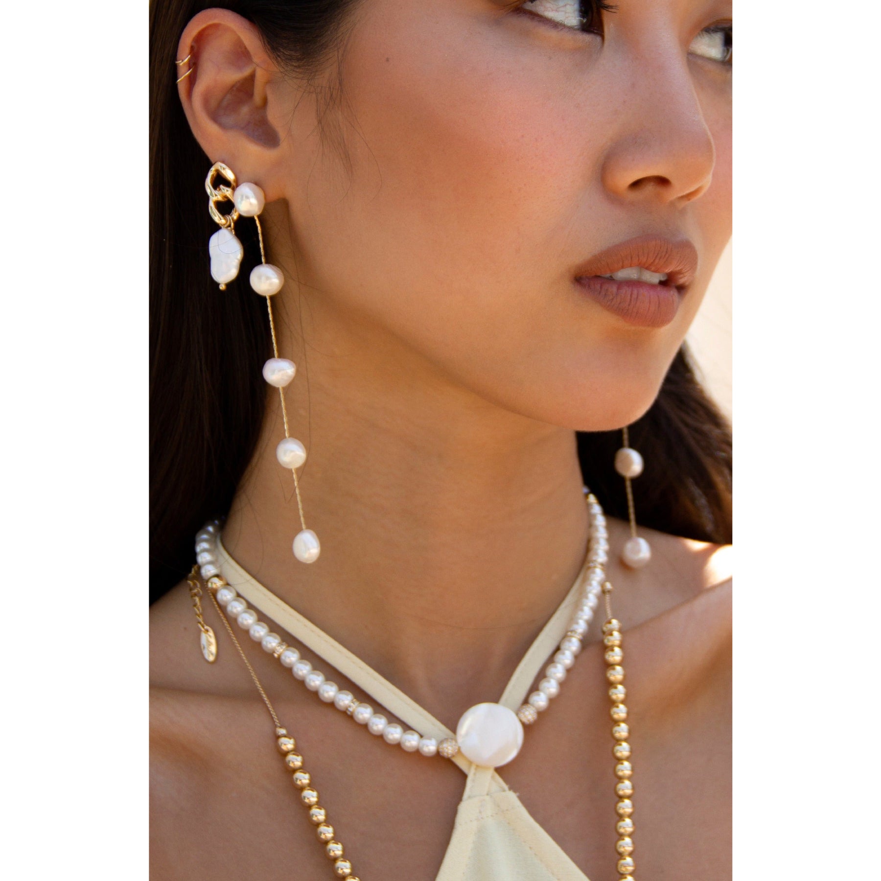 Realza tu estilo elegante y contemporáneo con estos hermosos aretes colgantes con baño de oro de 18k y perlas blancas para mujer de Ettika. Elaborados con precisión y cuidado, estos aretes cuentan con perlas blancas brillantes que cuelgan delicadamente de un impresionante engarce bañado en oro de 18k.