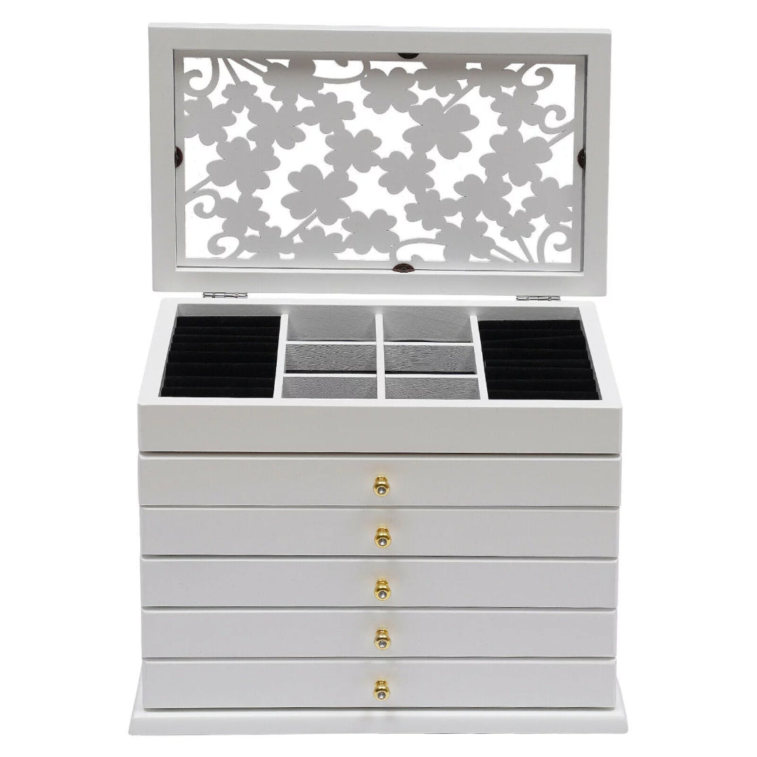 Simplemente elegante, la colección de exhibición de joyas tiene un aire vintage con comodidades modernas. Con cinco cajones con compartimentos de diferentes tamaños y dos secciones con porta anillos, esta caja satisfará sus necesidades de almacenamiento. Y el pino blanco oscuro y los patrones elegantes y complejos de flores exquisitas talladas hacen que este organizador de joyas sea más único y hermoso y completan la sensación contemporánea y las opciones de almacenamiento perfectas de este suntuoso joyero.