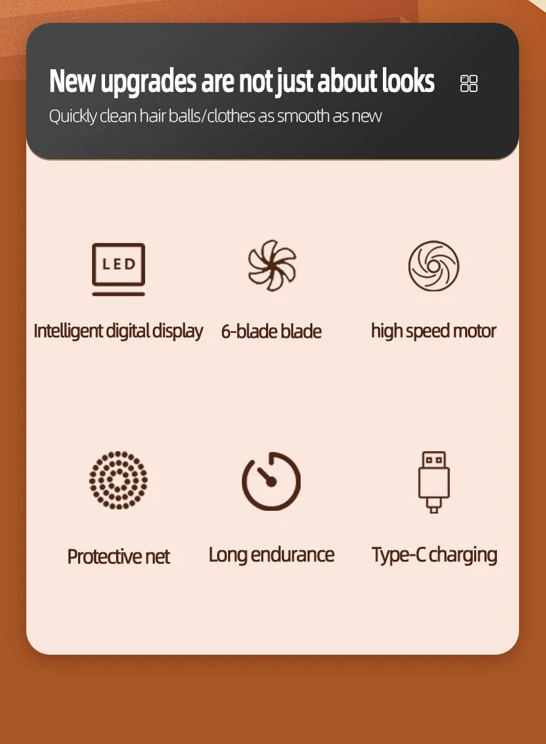 Introducing the Lint Remover USB Charging Electric Pellet Machine - your ultimate solution for revitalizing clothes and keeping them free from pesky lint and fuzz! This high-speed portable lint trimmer is engineered with a robust motor that efficiently eliminates lint, hairballs, and pilling, rejuvenating your favorite garments with ease. Its sleek and lightweight design makes it ideal for both home use and travel, ensuring you can tackle lint issues wherever you are. With a built-in LED digital display for real-time battery monitoring and a durable stainless steel 6-leaf blade, this lint remover guarantees effective performance every time. Experience the convenience of Type-C fast charging, and rest assured knowing that the protective clothing net will keep your fabrics safe during use. Transform your clothing care routine and enjoy a fresher wardrobe with this essential tool!
