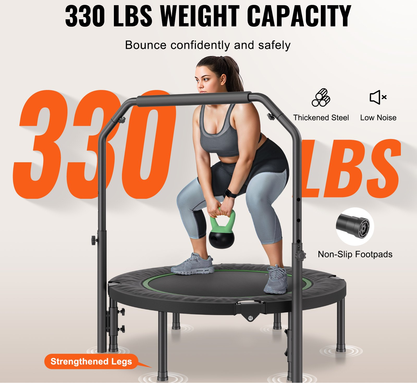 Foldable Mini Trampoline, 40 Inch Fitness Rebounder, Max Load 330lbs Exercise Trampoline, Stable & Quiet Trampoline with 4 Level Height Adjustable Foam Handle, for Adults Indoor/Garden Workout