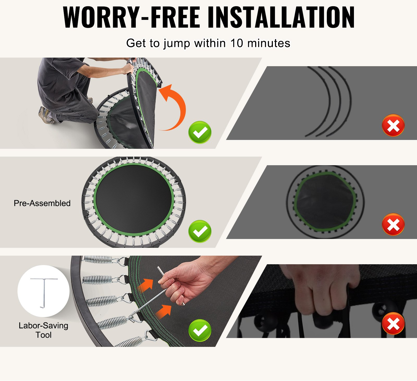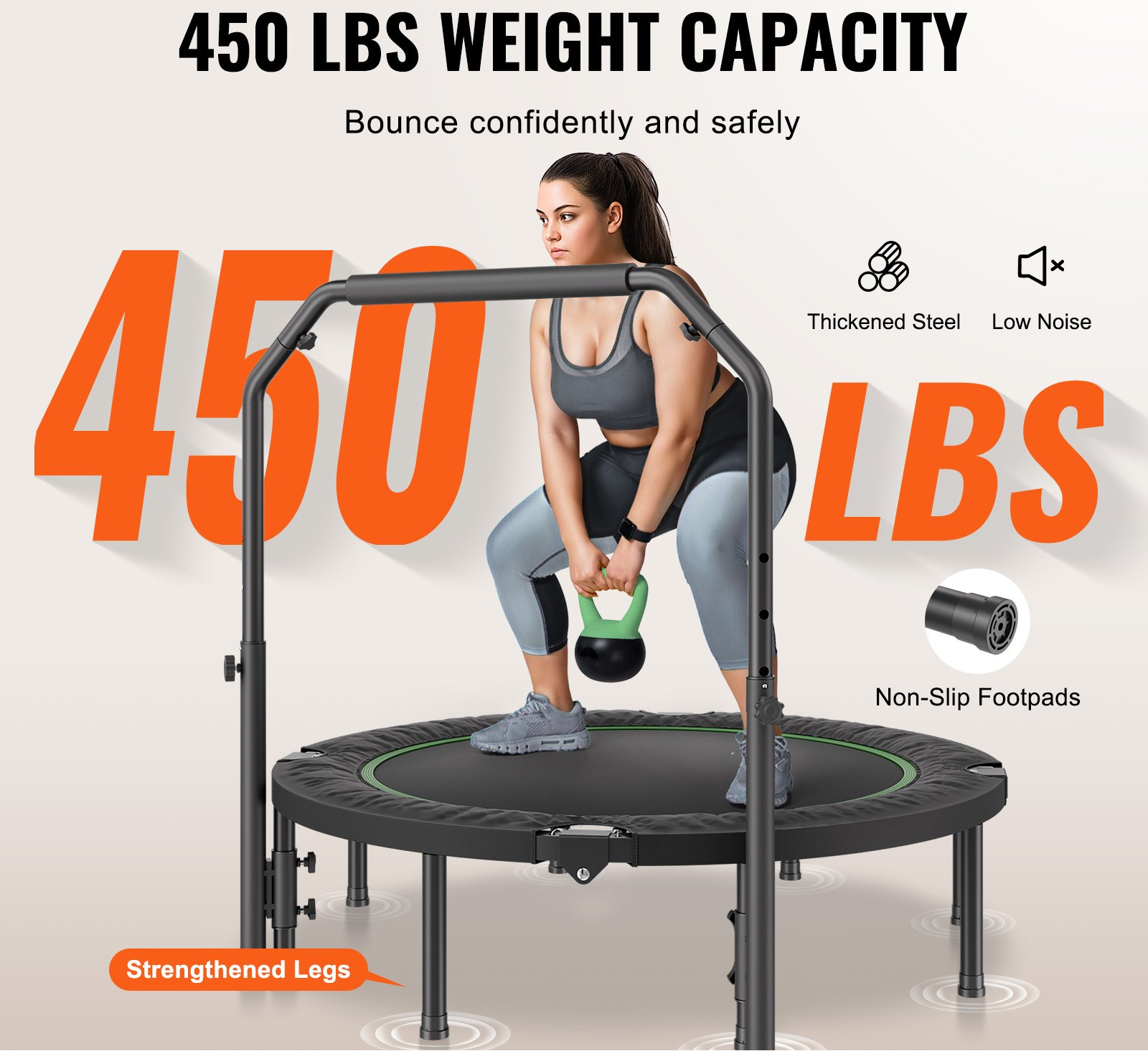 Foldable Mini Trampoline, 52 Inch Fitness Rebounder, Max Load 450lbs Exercise Trampoline, Stable & Quiet Trampoline with 4 Level Height Adjustable Foam Handle, for Adults Indoor/Garden Workout
