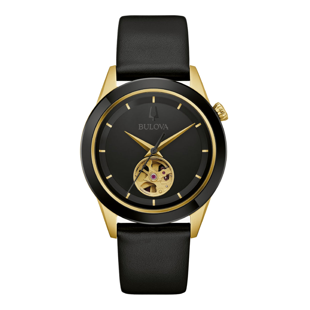 The Bulova Apollo Automatic Men's 40mm Analog Strap Watch - Black is a masterful blend of sophistication and functionality, capturing the essence of New York City through its striking design. With a bold 40mm two-tone stainless steel case featuring black IP-coating and elegant gold-tone accents, this watch makes a statement on any wrist. The edge-to-edge metallized crystal enhances its modern appeal, while the deep black dial with gold-tone hands and markers ensures clarity and style. An open-heart aperture reveals the intricate 21-jewel automatic movement, showcasing the watch's exceptional craftsmanship. Designed for the man who values both aesthetics and performance, this timepiece boasts a 42-hour power reserve and a luxurious leather strap for secure, comfortable wear.