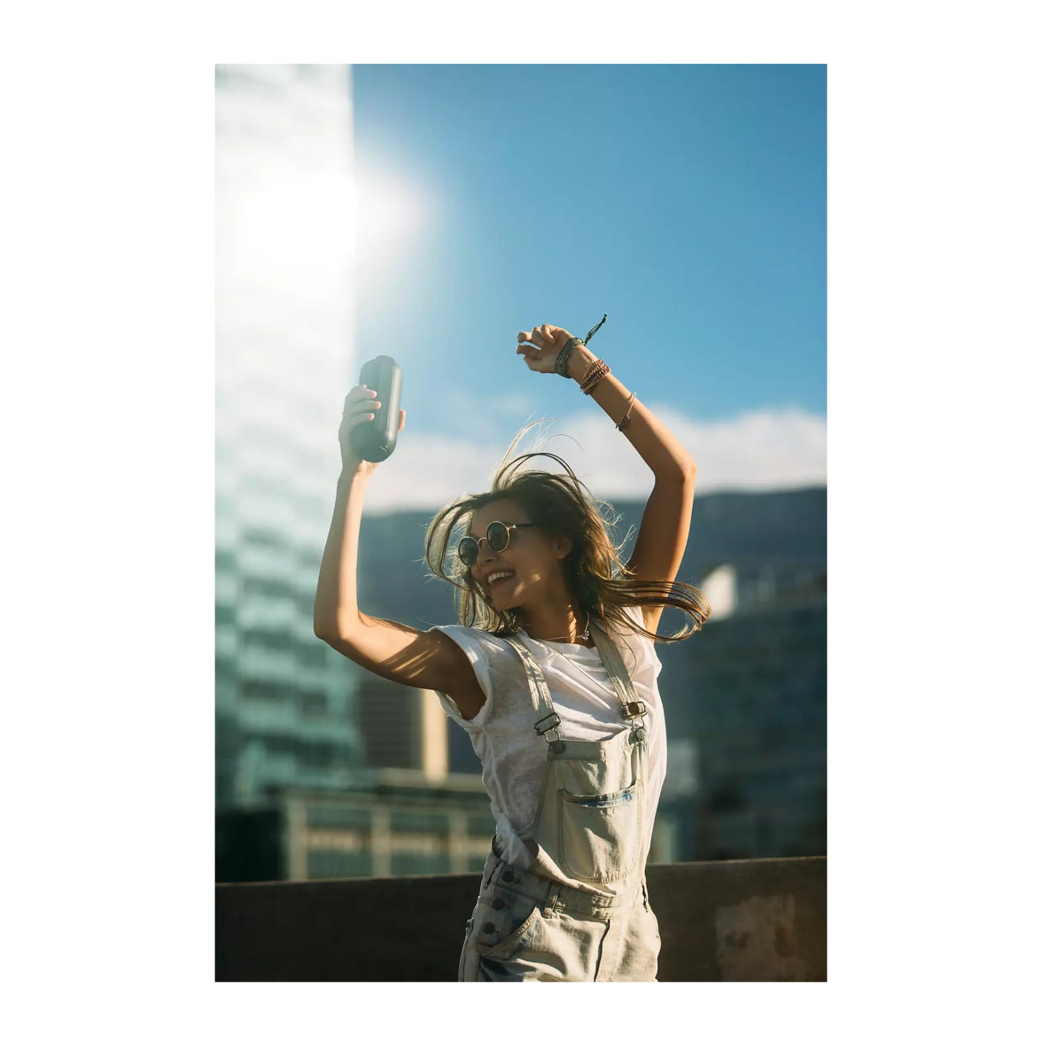 Coloca el altavoz en cualquier posición que desees, ya sea vertical u horizontal. El sonido de 360° te permite disfrutar de un gran sonido en todo momento. Es resistente a las salpicaduras y está equipado con transmisión de música inalámbrica, por lo que te ofrece un sonido cálido y natural dondequiera que vayas.