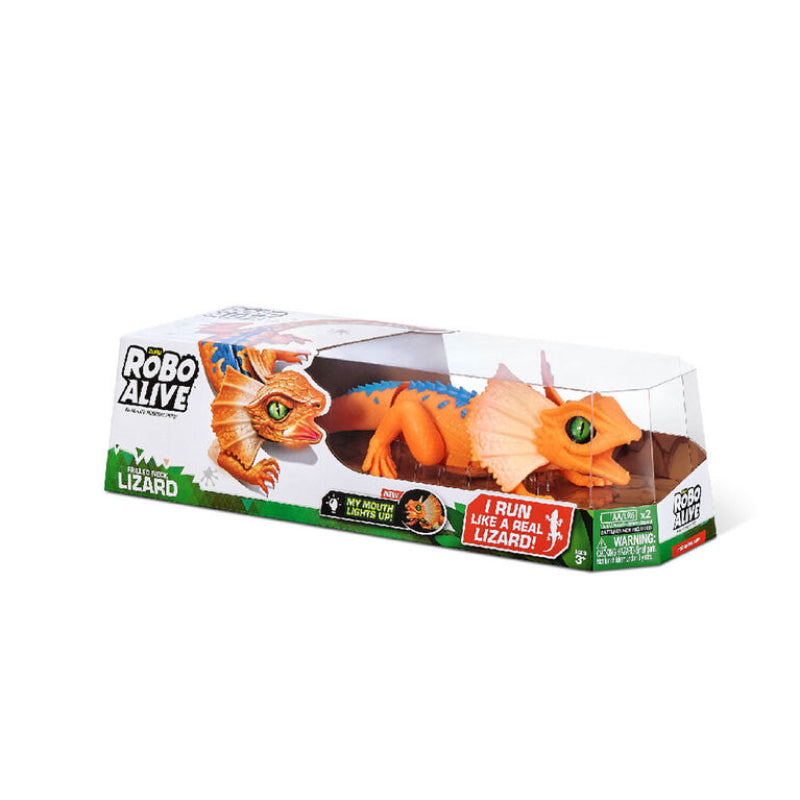 Tiene ojos deslumbrantes reales, una cola y cabeza de goma suave y un sensor de inclinación de cabeza ultra genial que hace que se detenga y busque presas cuando inclinas su cuello. Este lagarto acechante también tiene un cuello con volantes y una boca que se ilumina para protegerlo de los depredadores incluso en situaciones peligrosas. El lagarto robótico con cuello con volantes que se ilumina en Robo Alive demuestra el movimiento de un lagarto como si fuera real. ¡Como un lagarto genuino, este se mueve y corre!