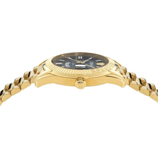 Con una caja de acero inoxidable en tono dorado y una esfera azul de tres manecillas encerrada en cristal de zafiro, este reloj para hombre es una combinación de simplicidad funcional con un toque de elegancia.