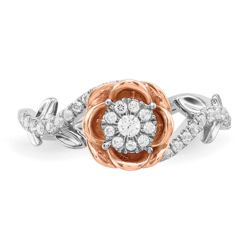 La combinación de oro blanco y rosa con diseños florales suele crear un aspecto hermoso y romántico. Los diamantes redondos de 0,25 quilates de peso total añaden un toque de brillo y elegancia, mientras que el acabado pulido le da una apariencia elegante. El ancho de banda de aproximadamente 1/16" sugiere un estilo delicado y delicado, perfecto para alguien que prefiere un diseño sutil pero intrincado. En general, ¡suena como una hermosa elección para un anillo de compromiso!