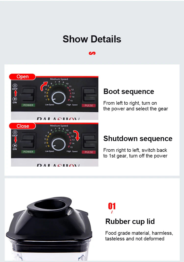 Introducing the 2000W Heavy Duty Commercial Blender – the ultimate high power ice smoothie maker designed for those who demand nothing but the best in performance and durability. Whether you're crafting smoothies, juices, or rice pastes, this blender delivers exceptional results every time. With its powerful 2000W motor and six-blade design, it efficiently blends even the toughest ingredients, making it ideal for commercial kitchens or passionate home chefs. The spacious 1.8-2.1L ABS container ensures that you can create large batches without compromising texture or taste.