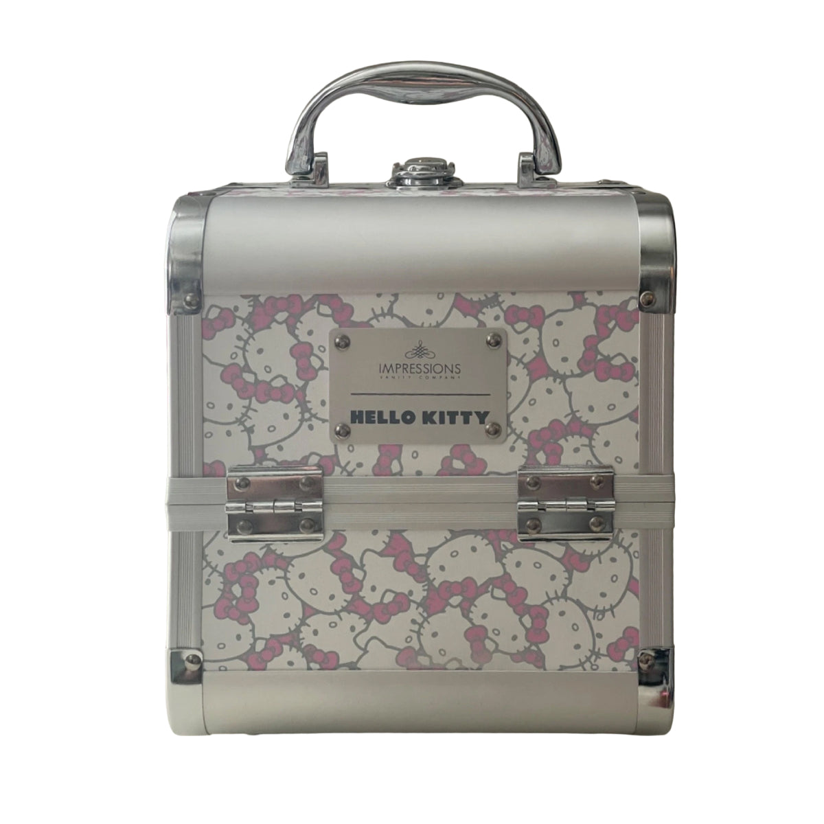 Travel in style with the Impressions Vanity Hello Kitty Slaycube Makeup Travel Case, a compact yet spacious cosmetic organizer designed for beauty lovers on the go. This tiered case features multiple compartments for easy organization, a built-in mirror, and a secure locking mechanism. It's fun and functional. Hello Kitty's design makes it perfect for fans and makeup artists alike. Built with a durable blend of canvas, metal, and plastic, this case is lightweight and portable, with a handle for effortless carrying.
