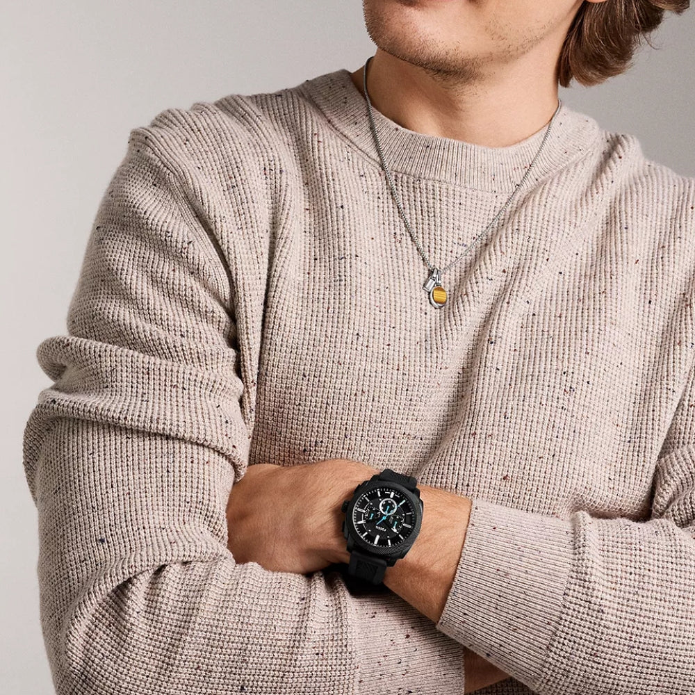 Inspired by classic American industrial machinery, the Machine Chronograph stands out with its bold knurled topring and rugged 44 mm black stainless steel case. The brushed black dial features textured detailing for a strong, masculine presence, protected by a durable mineral crystal. Powered by a reliable quartz chronograph movement and paired with a robust black silicone strap, this timepiece delivers long-lasting performance and striking industrial style designed for everyday wear.