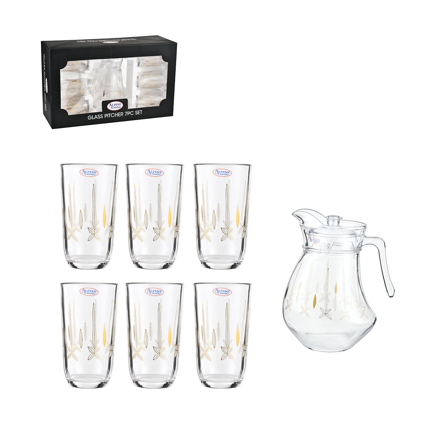 The Alpine Cuisine 7-Piece Glass Pitcher Set includes one elegantly designed 8oz glass jug and six matching glasses, perfect for serving beverages in style. Each piece features a delicate floral pattern with gold accents, adding a touch of sophistication to any table setting. Ideal for both everyday use and special occasions, this set combines functionality with a classic, refined look.