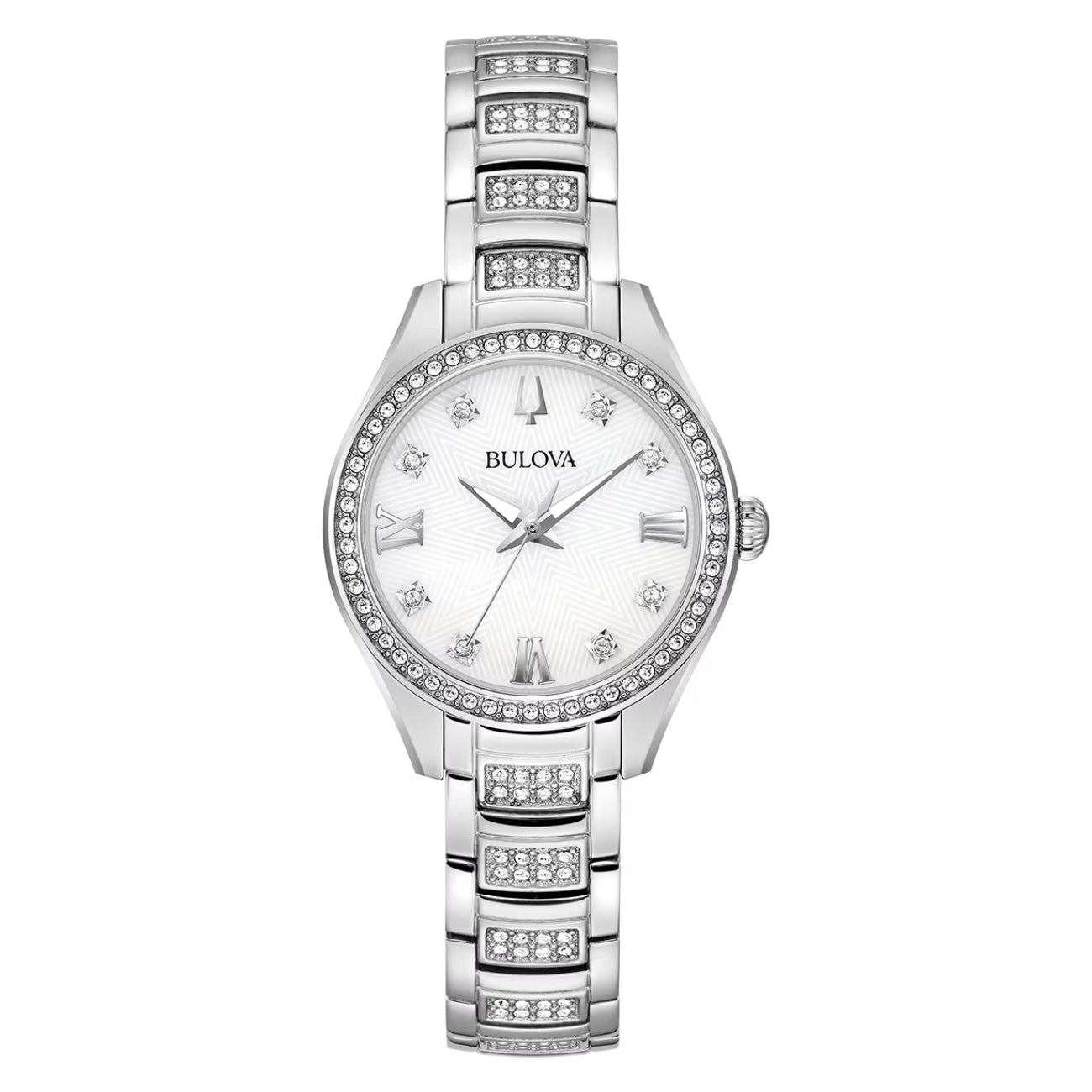 Reloj de pulsera de acero inoxidable para mujer Bulova Crystal de 28,5 mm con esfera blanca