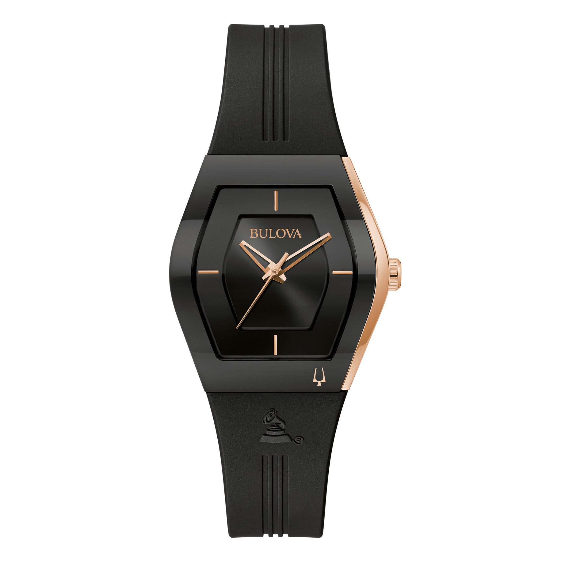 Como socio oficial de relojes de los Latin GRAMMYs, Bulova ha creado el Latin GRAMMY Gemini, un nuevo diseño de tonel curvo. La distintiva caja asimétrica de acero inoxidable de 31 mm en tono oro rosa con un cristal metalizado curvo Futuro de borde a borde negro presenta una esfera negra con detalles en tono oro rosa. La correa de silicona negra presenta el icónico logotipo de Latin GRAMMY en el frente, así como en la parte posterior de la caja, que muestra el logotipo de color platino para conmemorar la 21.ª Entrega Anual de los Latin GRAMMYs. El reloj para mujer presenta un movimiento de cuarzo de tres manecillas, una hebilla desplegable con pulsadores y resistencia al agua hasta 30 metros.