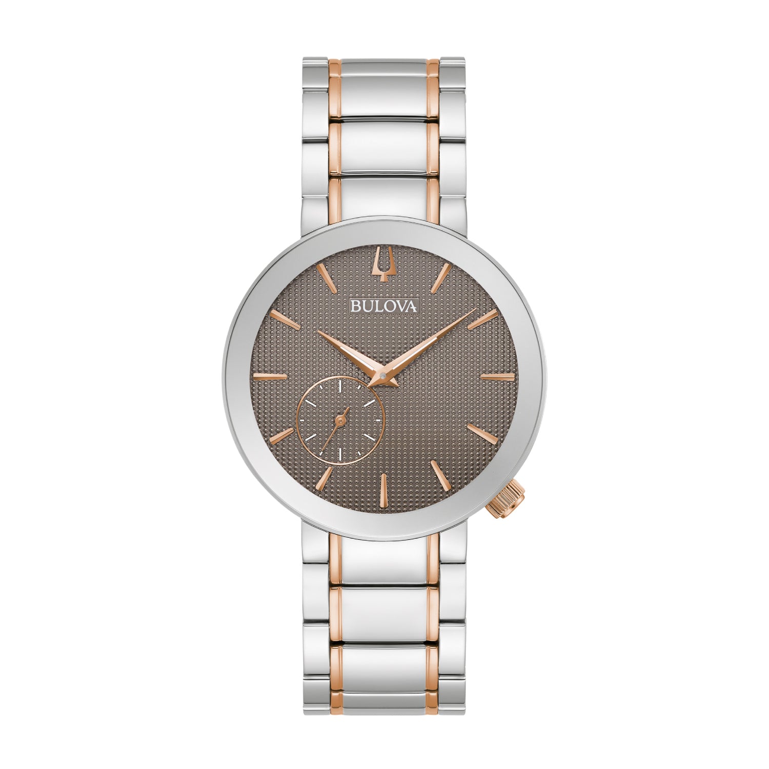 Este nuevo reloj para dama de Bulova se suma a la Colección Latin Grammy y continúa la celebración de la marca de la entrega de premios y los artistas extraordinarios que la hacen posible. Un cristal de zafiro metalizado curvado de borde a borde crea una caja de 35 mm excepcionalmente moderna, que cuenta con acero inoxidable en tono plateado y una corona en tono oro rosa. La esfera texturizada está acentuada con manecillas y marcadores en tono oro rosa y una subesfera de segundos. En la parte posterior del reloj, la caja con tapa atornillada está estampada con el logotipo de Latin Grammy.
