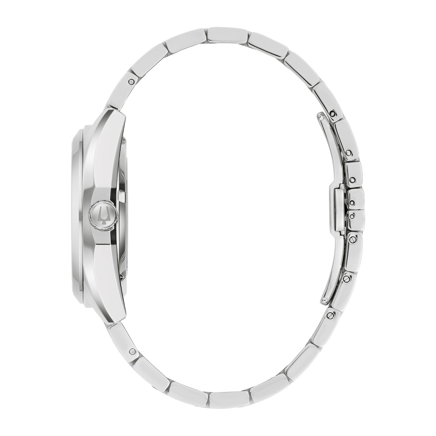 El Surveyor de Bulova para hombre se define por su calidad excepcional y su estética sofisticada. La caja de acero inoxidable en tono plateado presenta bordes esculpidos y facetas que proporcionan un uso sin esfuerzo en la muñeca, con acabado pulido y cepillado, un cristal de zafiro plano y una pulsera de acero inoxidable de 3 eslabones de liberación rápida a juego con un cierre desplegable con pulsador. El llamativo reloj presenta detalles en tono plateado, manecillas con relleno luminiscente, marcadores de minutos en relieve y una pantalla de fecha ampliada. El reloj está equipado con un mecanismo automático de 21 rubíes y una reserva de marcha de 42 horas, que se puede ver en su totalidad a través de una ventana de exhibición de cristal mineral en el fondo de la caja. Para aquellos con un ojo exigente para el lujo refinado, este reloj de hombre de Bulova es la opción obvia.