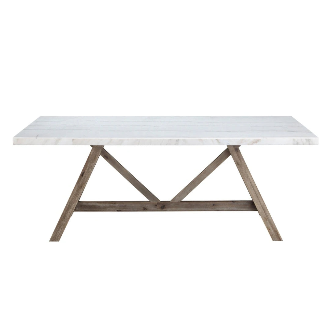 Discover the epitome of elegance with the Dorset Hills 7pc Counter Height Dining Set. Beautifully crafted using pristine white marble veneers, this dining set exudes luxury with a touch of natural charm. Measuring a generous 60" in length and 40" in width, the pub table features a robust base made of sand-blasted birch wood that ensures stability while enhancing its sophisticated appearance. The clever storage space beneath the table integrates function with form, making it perfect for those who appreciate style without sacrificing practicality. Complementing the table, the chairs are upholstered in refined grey linen, offering both comfort and a chic aesthetic. Let the Dorset Hills Dining Set bring a harmonious blend of nature's beauty and modern sophistication to your dining space.