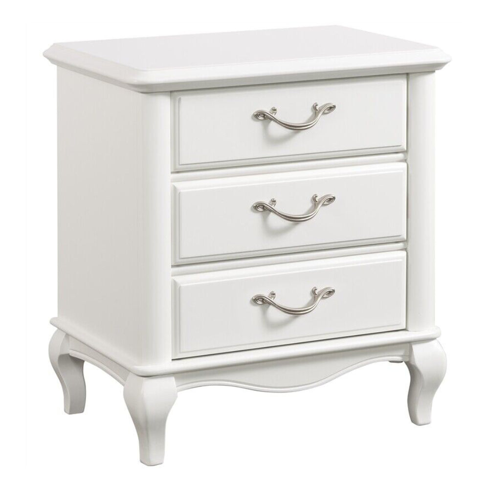 The Kelly Nightstand by Martin Svensson Home beautifully combines functionality and elegant design, making it a perfect addition to any bedroom. With its charming country French styling, the Kelly Nightstand features graceful cabriole legs, scalloped moldings, and intricate carvings that enhance your decor. The classic white finish complements various color schemes and furnishings, adding a touch of sophistication and warmth. Designed for convenience, it offers three spacious drawers for ample bedside storage, including a felt-lined top drawer to keep your valuables safe. The ribbon-themed drawer pulls in a chic nickel finish add a stylish touch, while the high-quality construction ensures durability and ease of use. The English Dovetail constructed drawer interiors, made from sturdy plywood, operate smoothly on full-extension ball-bearing guides, providing effortless access to your belongings. Transform your bedroom into a serene sanctuary with the Kelly Nightstand.