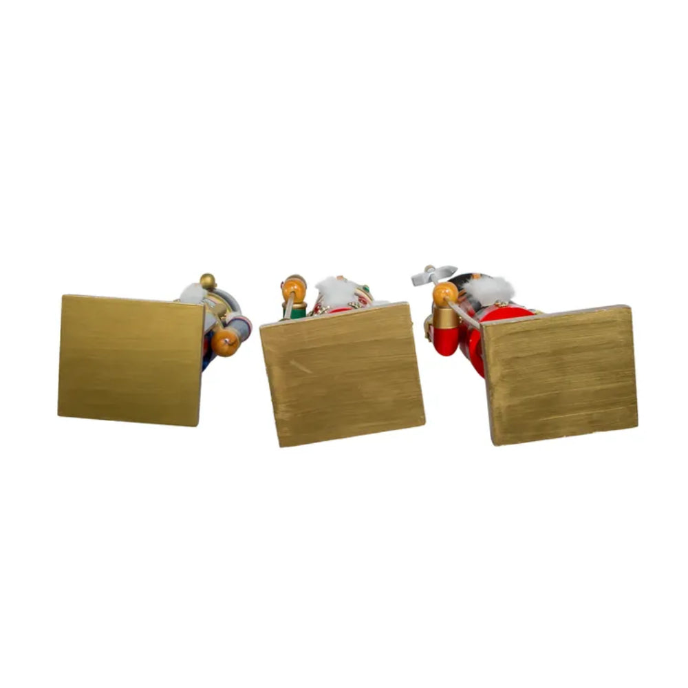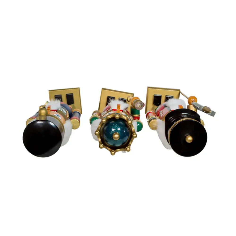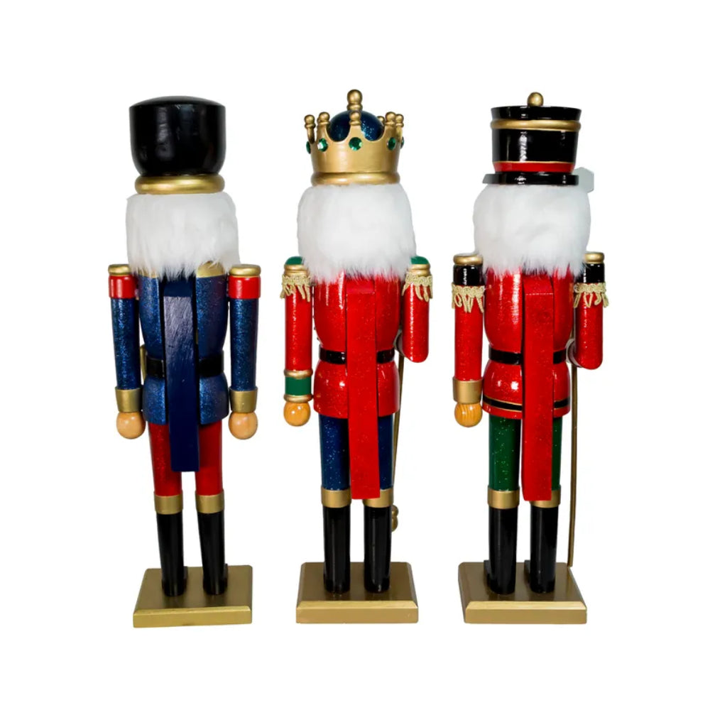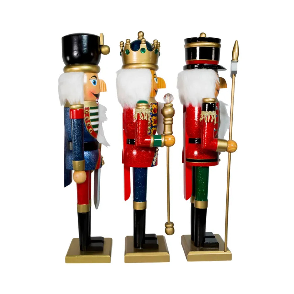 Estos cascanueces de soldado y rey de Kurt Adler son una encantadora incorporación a cualquier decoración navideña o colección de cascanueces. Este juego de tres cascanueces variados incluye un cascanueces rey con un traje marrón oscuro con detalles dorados y una corona real dorada. Sus soldados vienen en dos estilos festivos variados: uno con un abrigo azul con pantalones rojos y una espada a su costado, el otro con un abrigo rojo con pantalones verdes y sostiene un hacha.