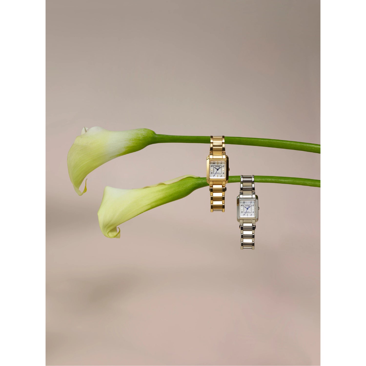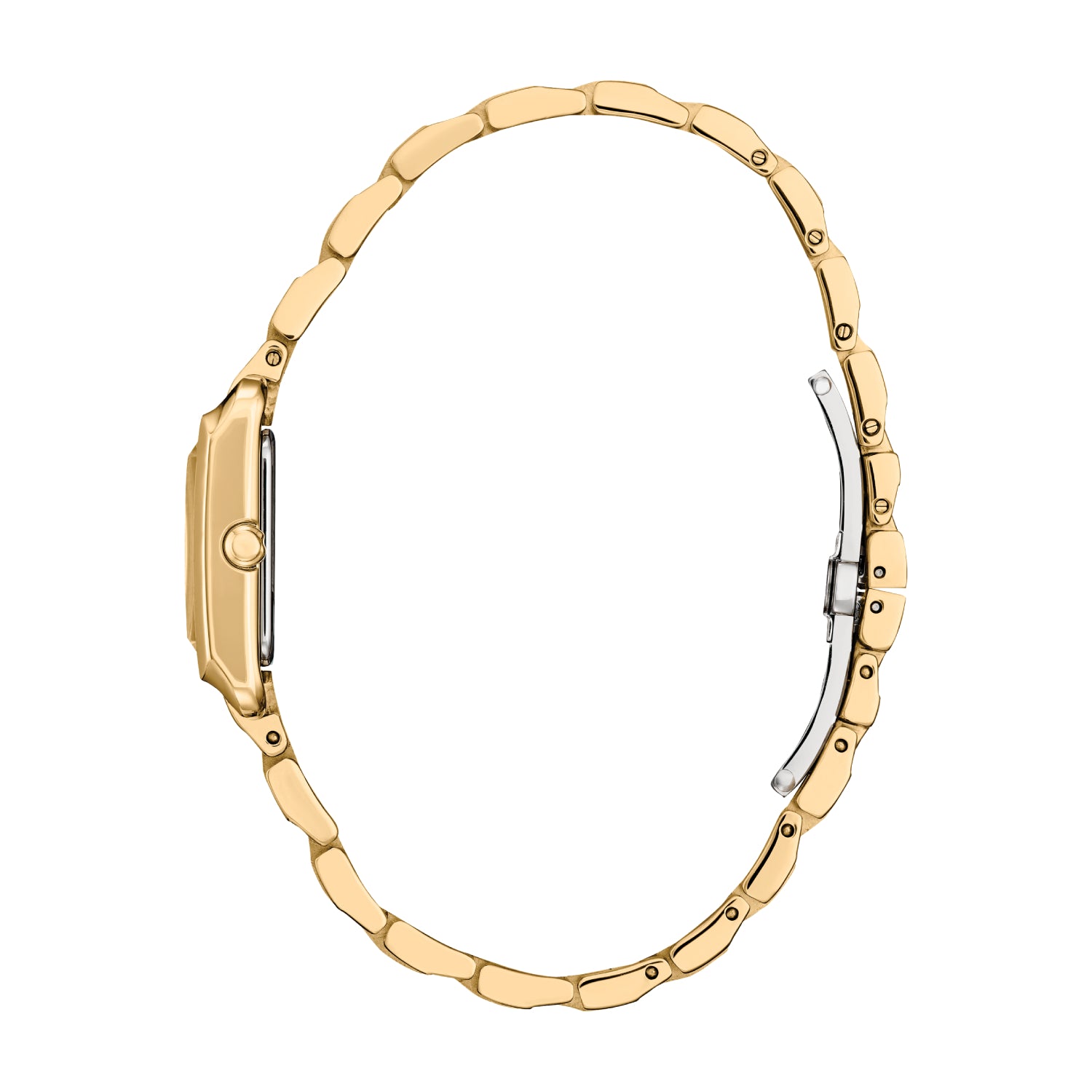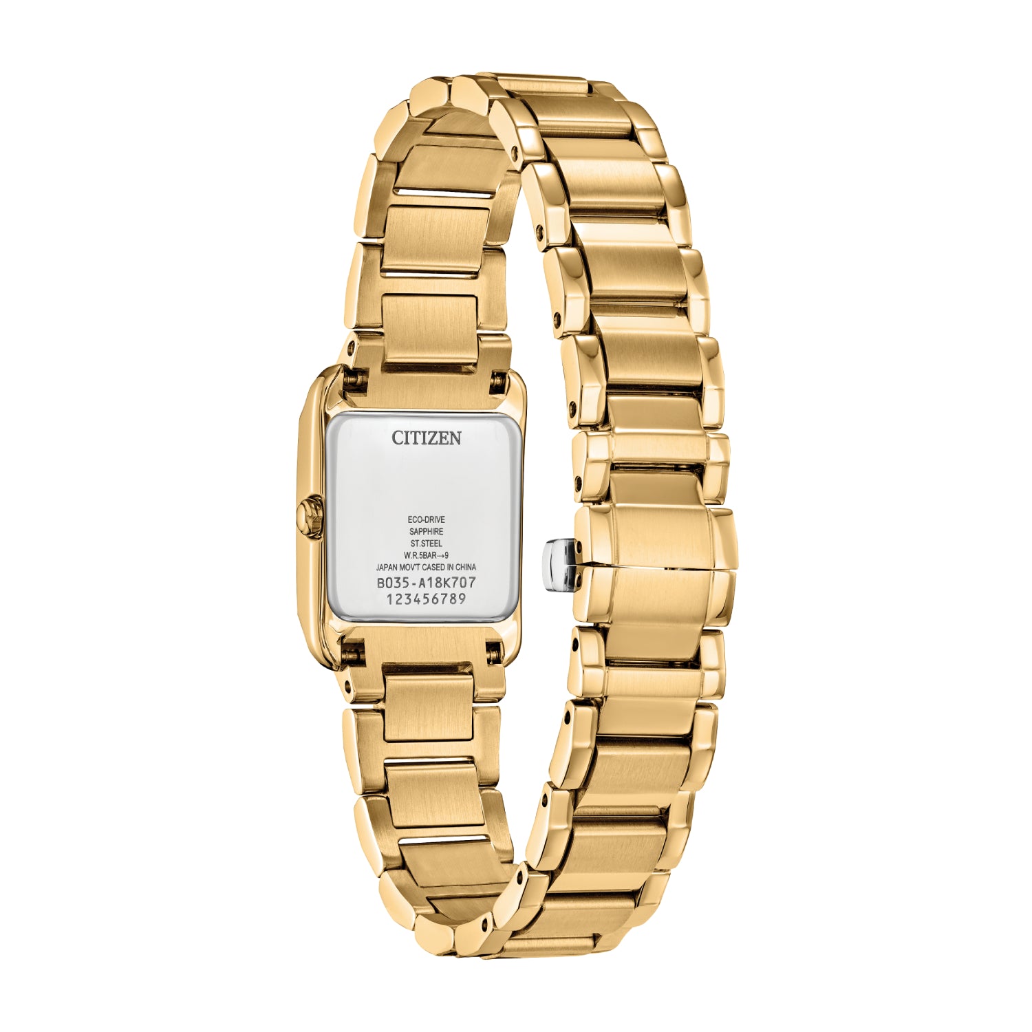 Las líneas clásicas y la sofisticación sutil hacen de esta última pieza de la colección femenina, el Citizen L Bianca, una encantadora incorporación al lujo sostenible. Con un diseño inspirado y que celebra los motivos femeninos del art déco, el distintivo reloj de acero inoxidable en tono dorado es un detalle cautivador en la muñeca que es perfecto para el uso diario. Una forma rectangular curva define la silueta de 22 mm del reloj, con una corona sutil y una pulsera de acero inoxidable en tono dorado que completan el look. En su esfera de nácar, los marcadores aplicados e impresos alternados funcionan con un par de manecillas con toques azules para un estilo altamente estético, con su cuadrado interior impreso que una vez más apunta a inspiraciones elegantes. Este elegante reloj para mujer, que se alimenta de forma sostenible con cualquier luz gracias a la tecnología patentada Eco-Drive que nunca necesita batería, es el complemento perfecto para cualquier atuendo.